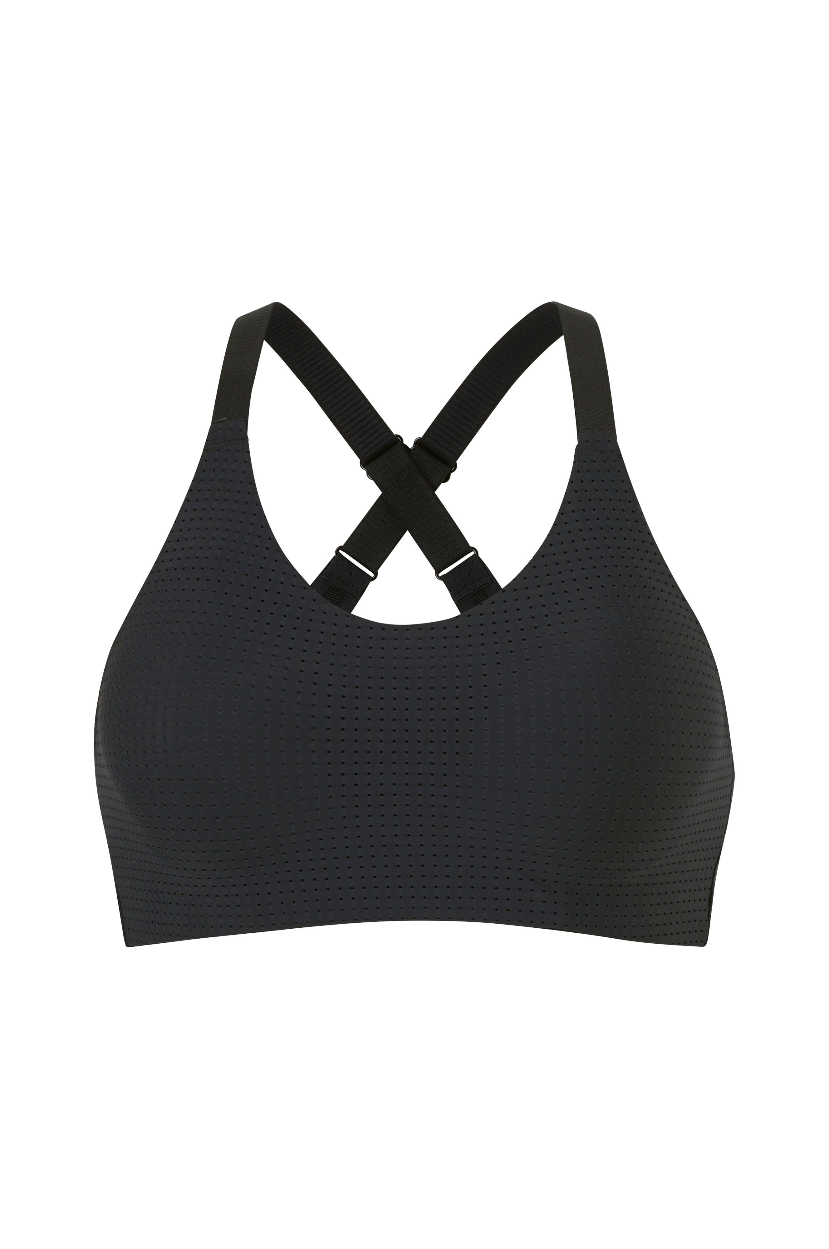 Sports-bh i ventilerende stof med stretch. Støtte ved medium intensitet. Det perforerede, fugttransporterende stof øger åndbarheden og holder dig tør under din træning. Støttende, formstøbte skåle og justerbare elastiske skulderstropper, som er krydsede bagpå. Lukning med hægte/malle bagpå.