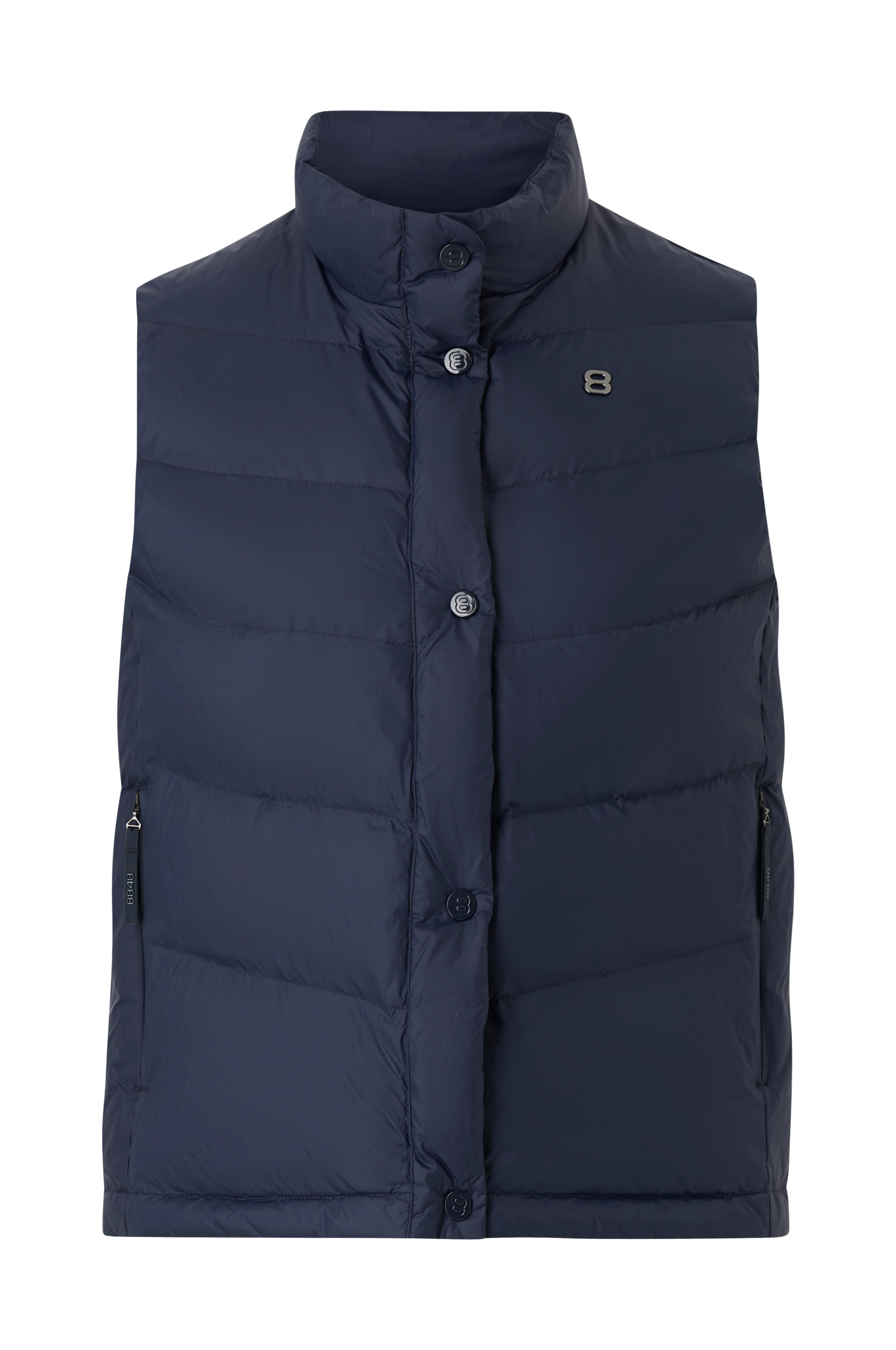 • Eksklusiv dunvest med kort, lige pasform• Vandafvisende, smudsafvisende ydermateriale med skinnende afslutning• Høj krave• Trykknapper• Sidelommer med lynlås• Træksnørre ved nederste kant
