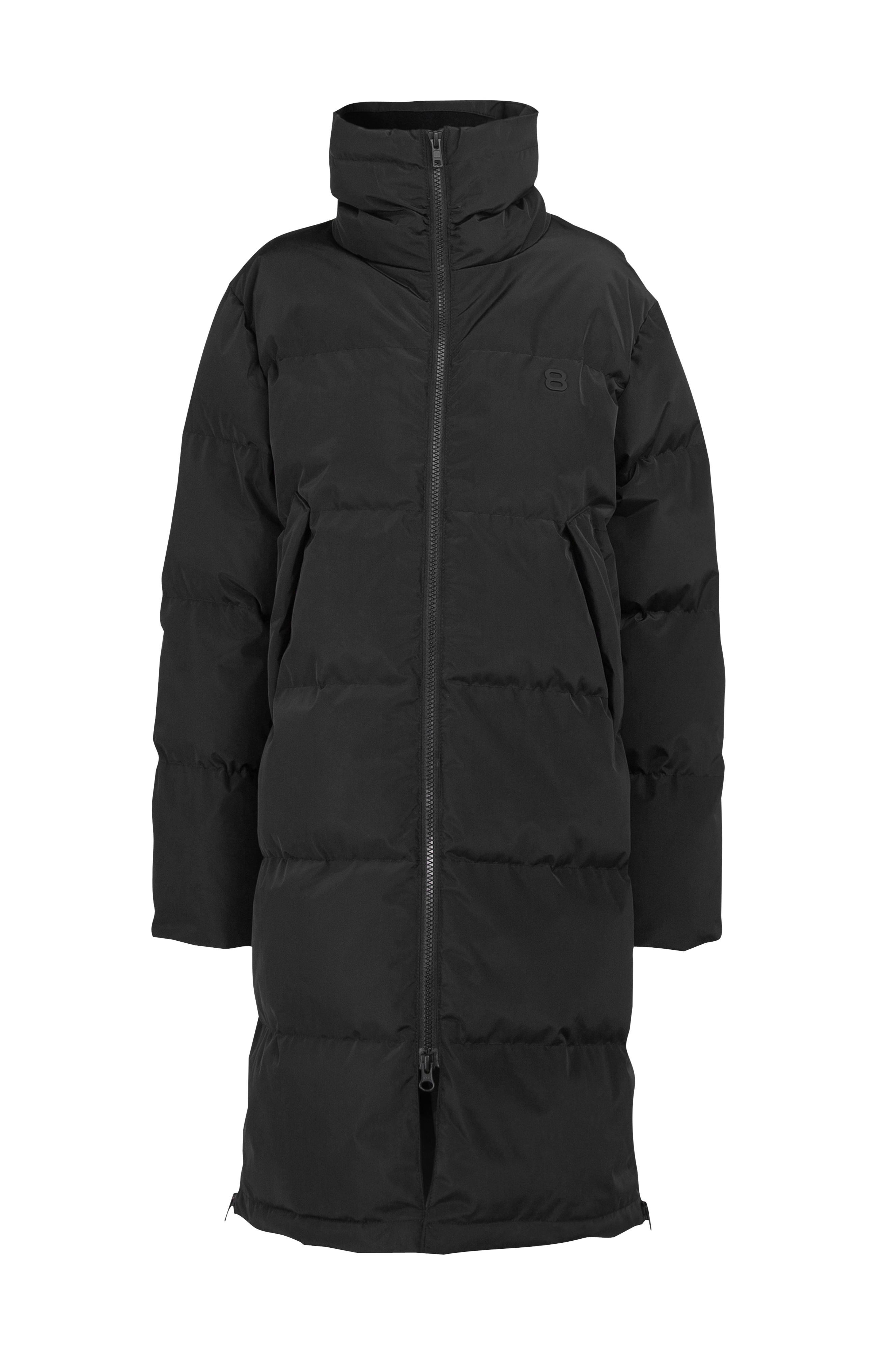 Vatteret frakke i trendy, lang oversize-pasform med et lidt skinnende yderstof. Varmende syntetisk fyld med dun-touch. Yderstoffet er både vind- og vandtæt for god beskyttelse mod vind og vejr, dog ikke med tapede sømme. Høj krave med blød, børstet jersey på indersiden. Frakkens lynlås har 2-vejsfunktion så den kan åbnes nedefra. Lynlåse i siderne forneden som kan åbnes. Alle lynlåse er i høj kvalitet fra YKK®. To taljelommer med blødt for.