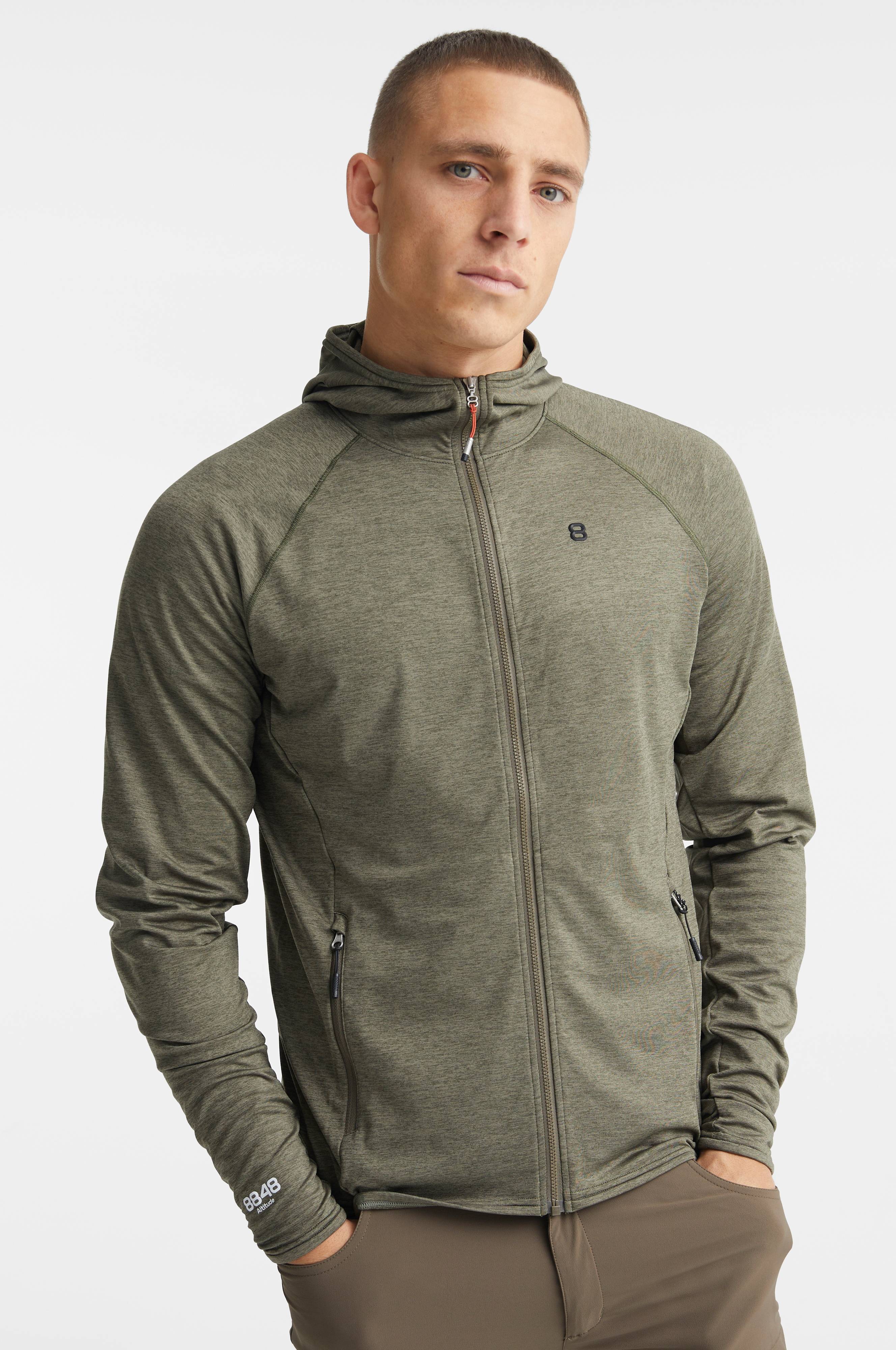 Teknisk funktionshoodie i et let og smidigt syntetmateriale med 4-vejsstretch. De fugttransporterende egenskaber hjælper med at holde hul kroppen tør og komfortabel. Indersiden er blødt børstet for ekstra behagelig følelse. Den melerede effekt i materialet giver liv og et eksklusivt look. Sporty pasform som sidder perfekt under jakken. Lynlås i fuld længde foran og to taljelommer med lynlås. "8" på brystet og et lille logo på ærmekanten.