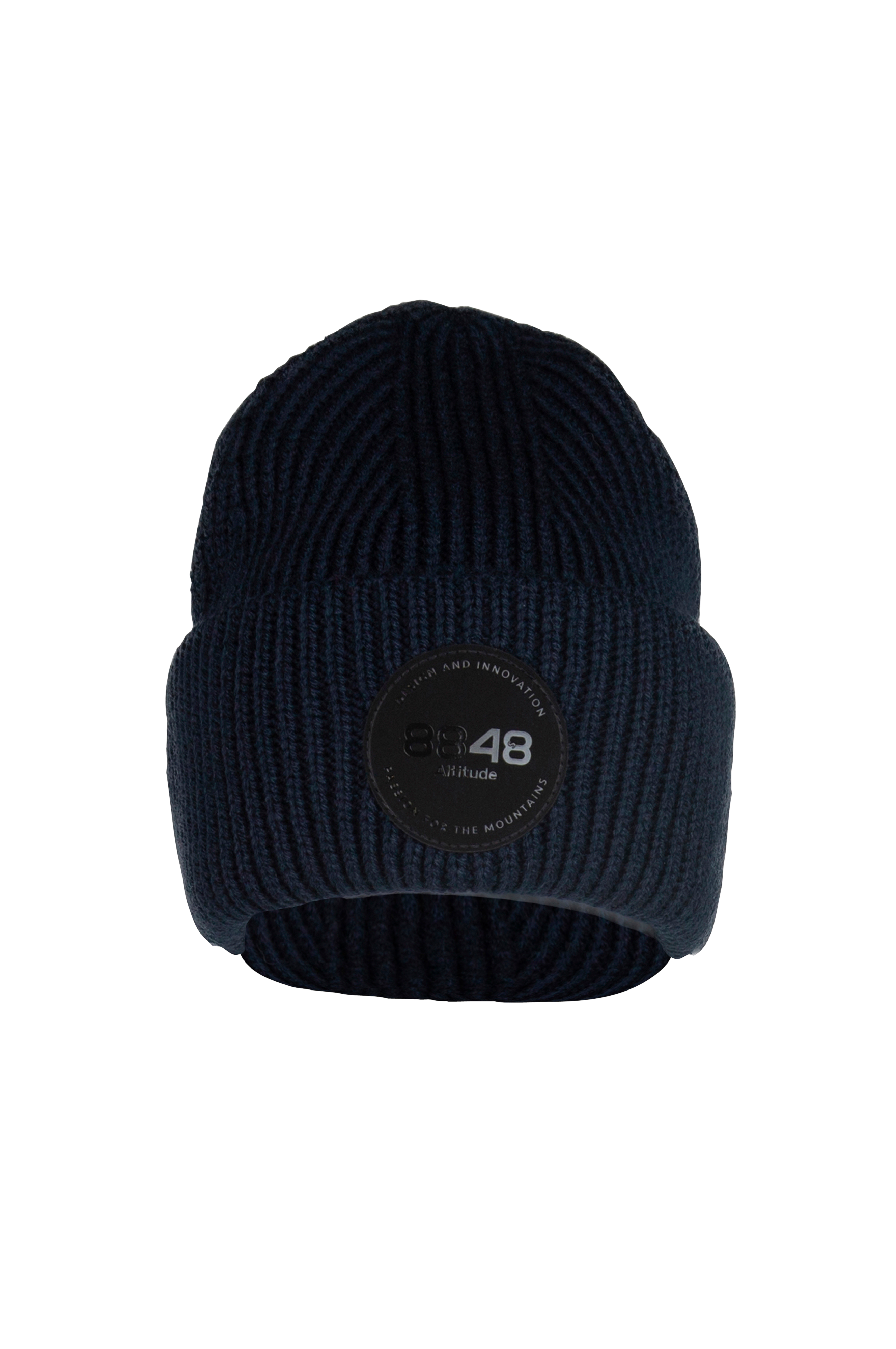 Hue Ethan Beanie fra 8848 Altitude er en ribstrikket hue i uldblanding med skøn varme og komfort. Bredt opslag og stort badge foran.
