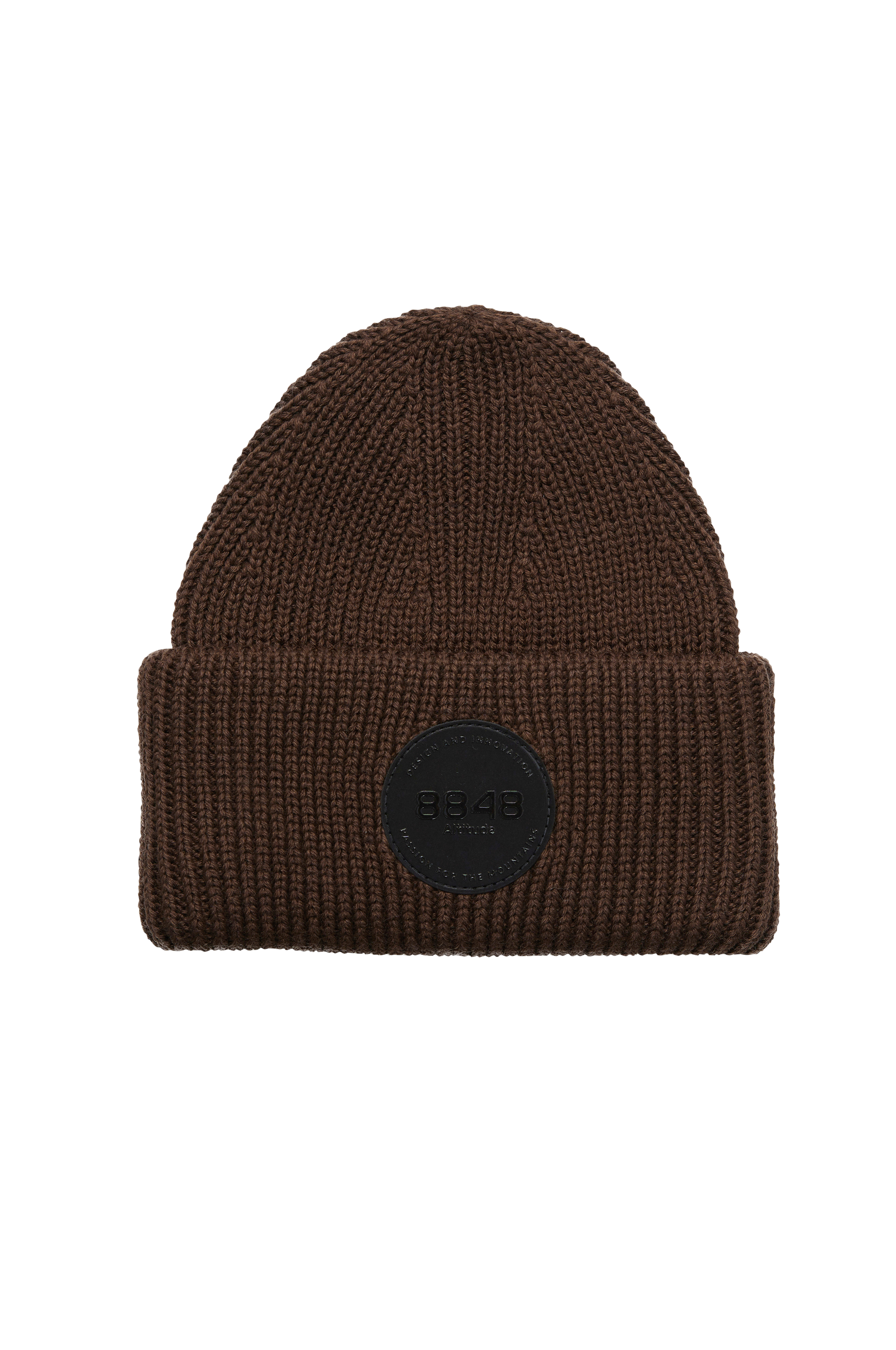 Hue Ethan Beanie fra 8848 Altitude er en ribstrikket hue i uldblanding med skøn varme og komfort. Bredt opslag og stort badge foran.