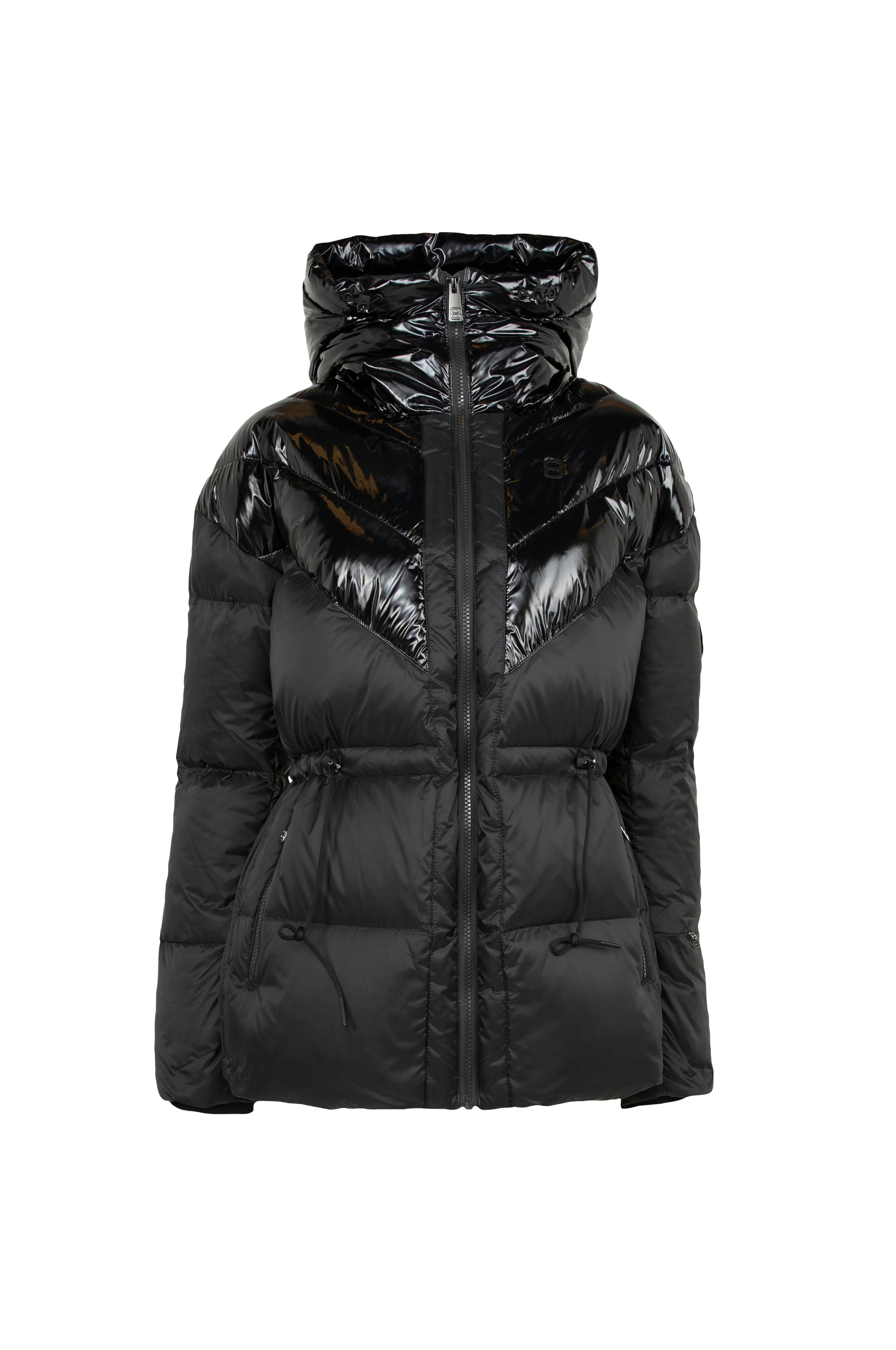 En eksklusiv og feminin ski- og vinterjakke med fyld af RDS-certificeret premium-dun. Trendy silhuet, oversized med markeret talje. Jakken er lavet af en kombination af et mat, let yderstof og et blankt lakstof på front, bærestykke og hætte.