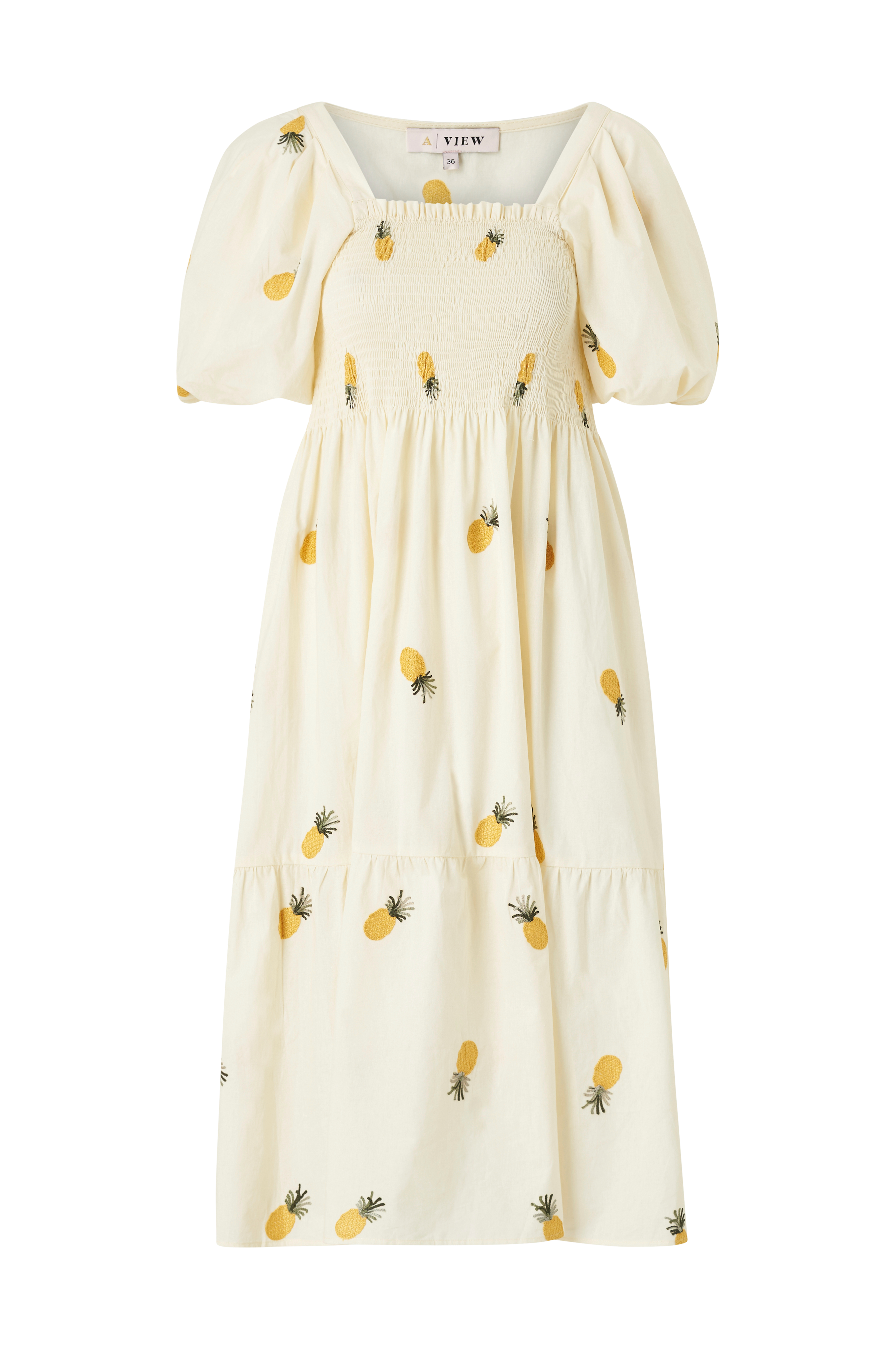 • Model med svaj• Smocket øvre del• Broderet mønster• Firkantet halsudskæring foran og bagpå• Voluminøse ballonærmer• Længde: 119 cm i størrelse 36