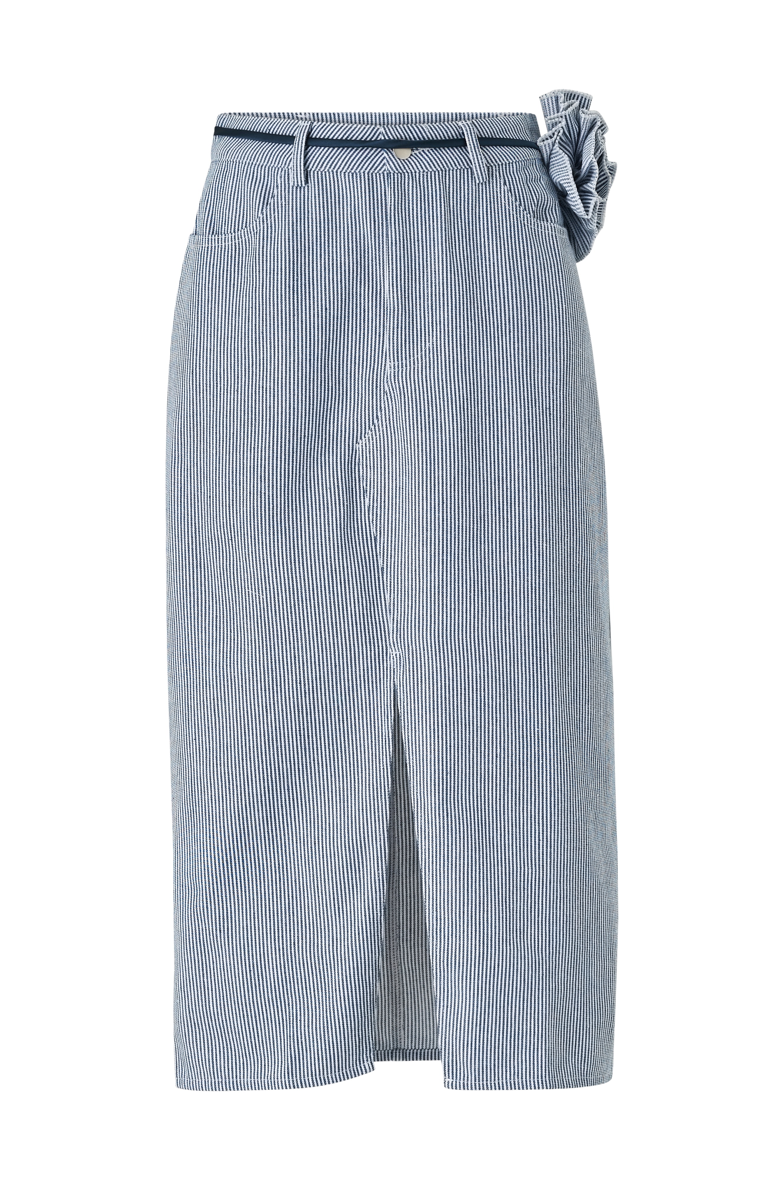 • Blå- og hvidstribet nederdel i denim• Knaplukning• Stropper• Gylp med lynlås• Sidelommer• Slids foran• Aftageligt marineblåt satinbånd med stribet rosenklips medfølger.• Længde: 83 cm i størrelse 36