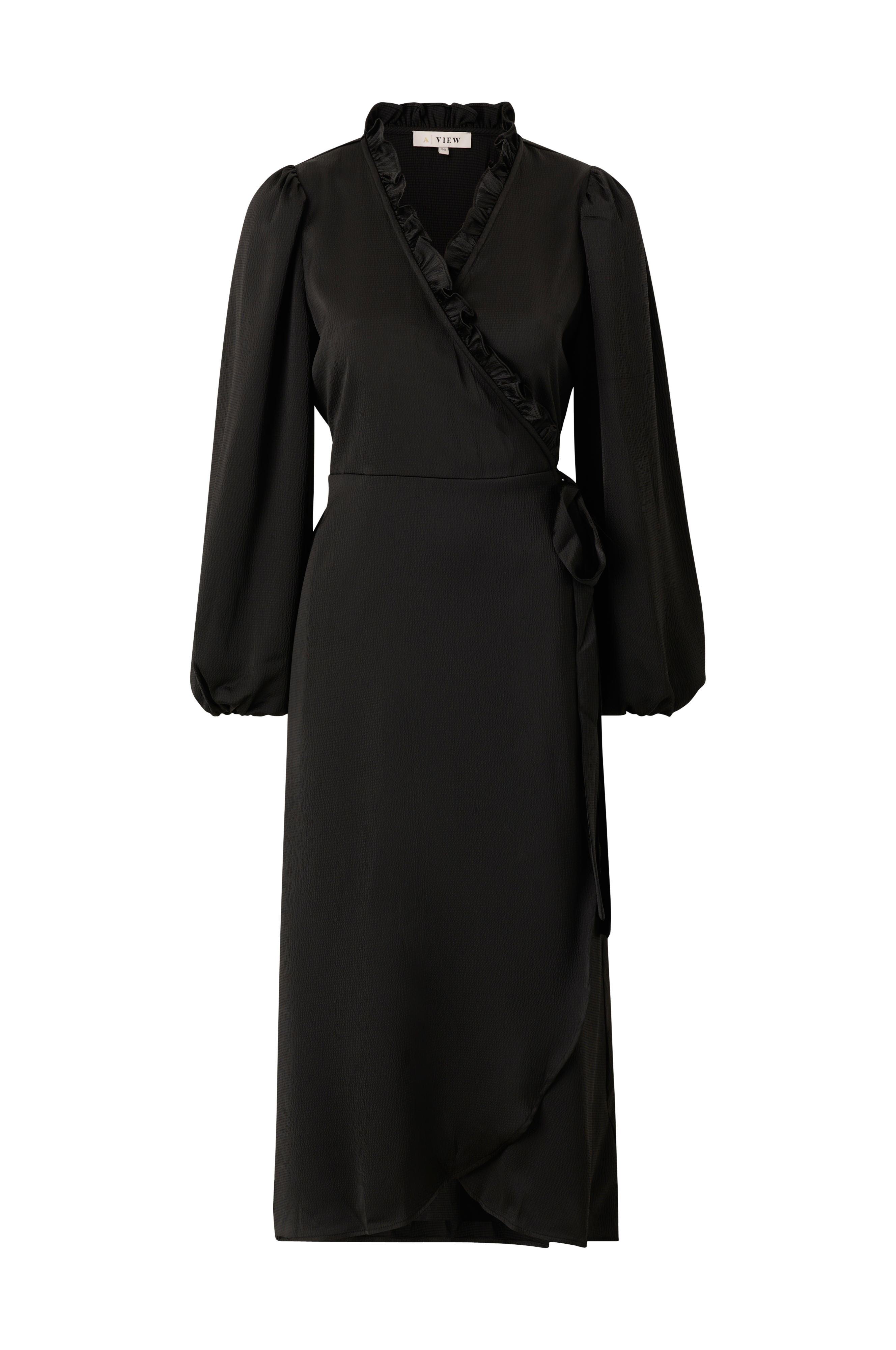 • Satinlook med let struktur• V-formet halsudskæring med flæsekant hele vejen rundt• Bindebånd i siden• Lange ballonærmer med elastisk bånd ved manchetterne• Længde: 124 cm i størrelse 36