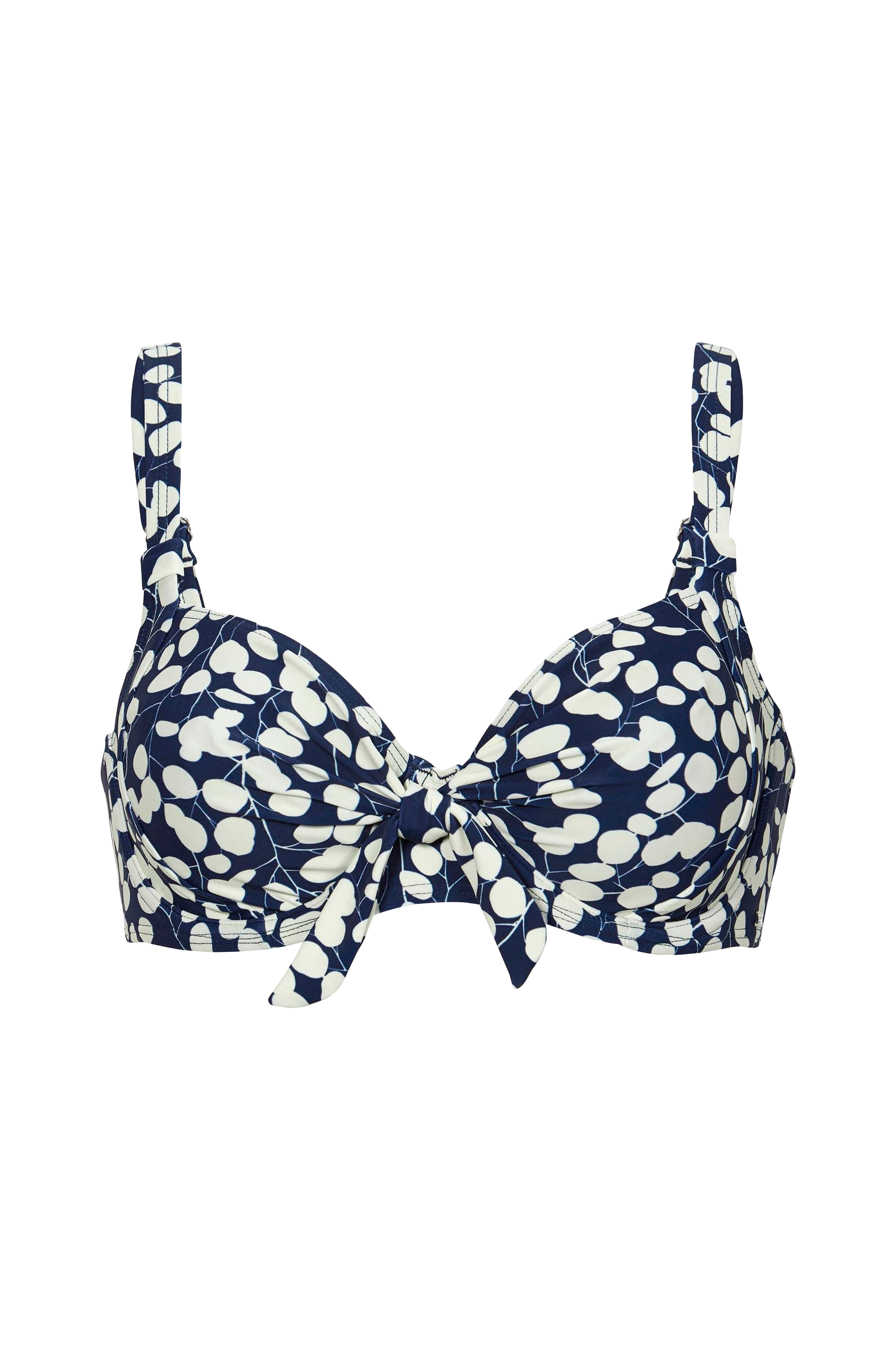 Mønstret bikinitop med bøjle og dekorativ sløjfe mellem skålene. Stabilt meshfor og sidestøtte giver ekstra god støtte og holder brystet på plads. Justerbare skulderstropper og metalspænde bagpå.