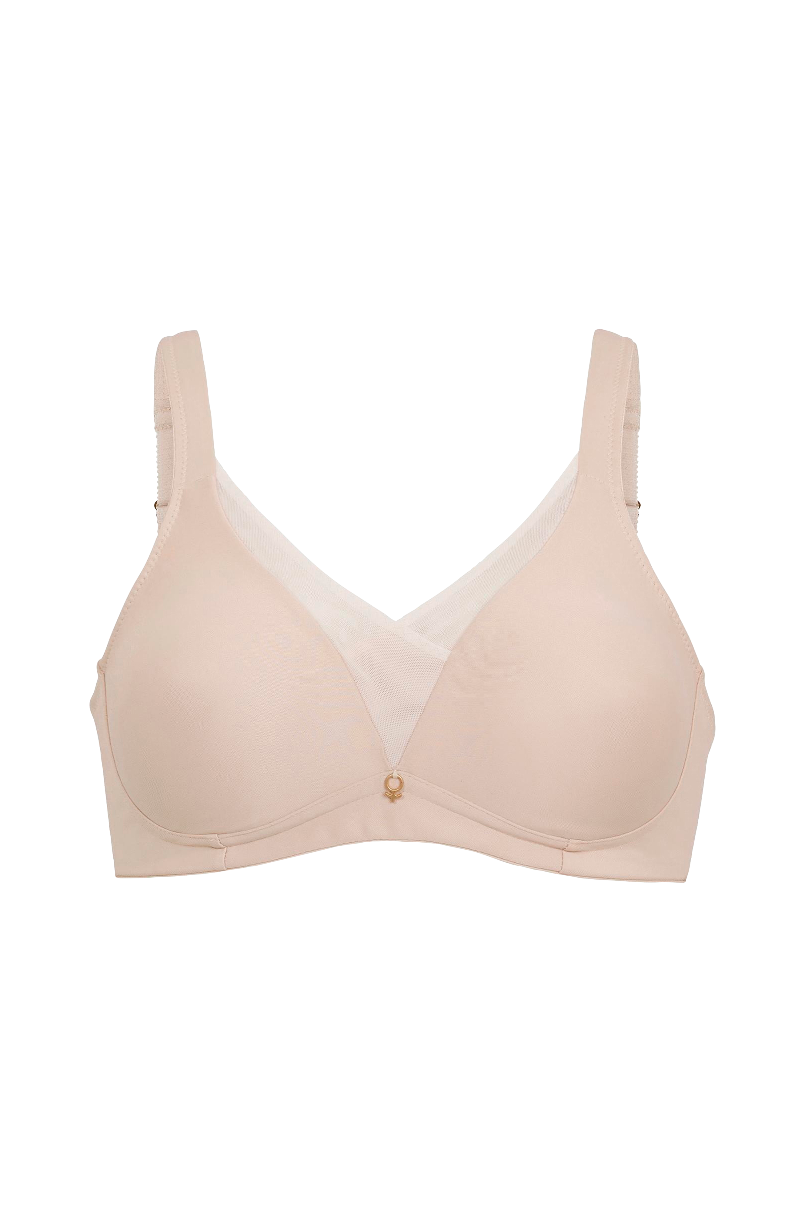 Tynde, formpressede skåle med støttende powermeshfor. V-nedringning med slå om-søm foran. Stabilt rygbånd med stretch for komfort. Justerbare og let vatterede skulderstropper. Hægte- og mallelukning i ryggen.