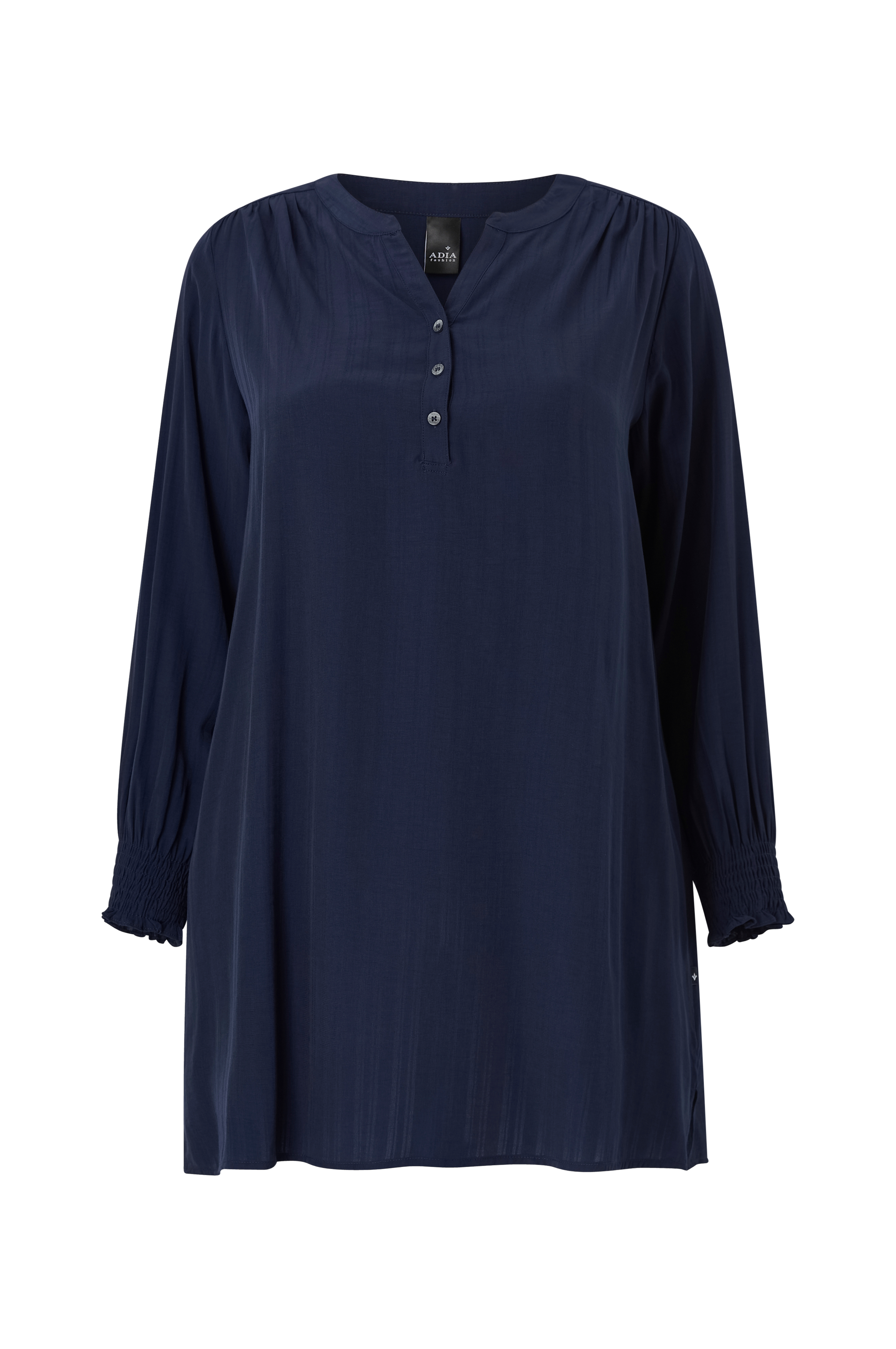 • Tynd, semitransparent bluse i viskoseblanding• V-formet halsudskæring med kort knaplukning foran nederst• Samling ved skuldrene• Ballonærmer med smock ved manchetterne• Slids nede i siderne• Plusstørrelser