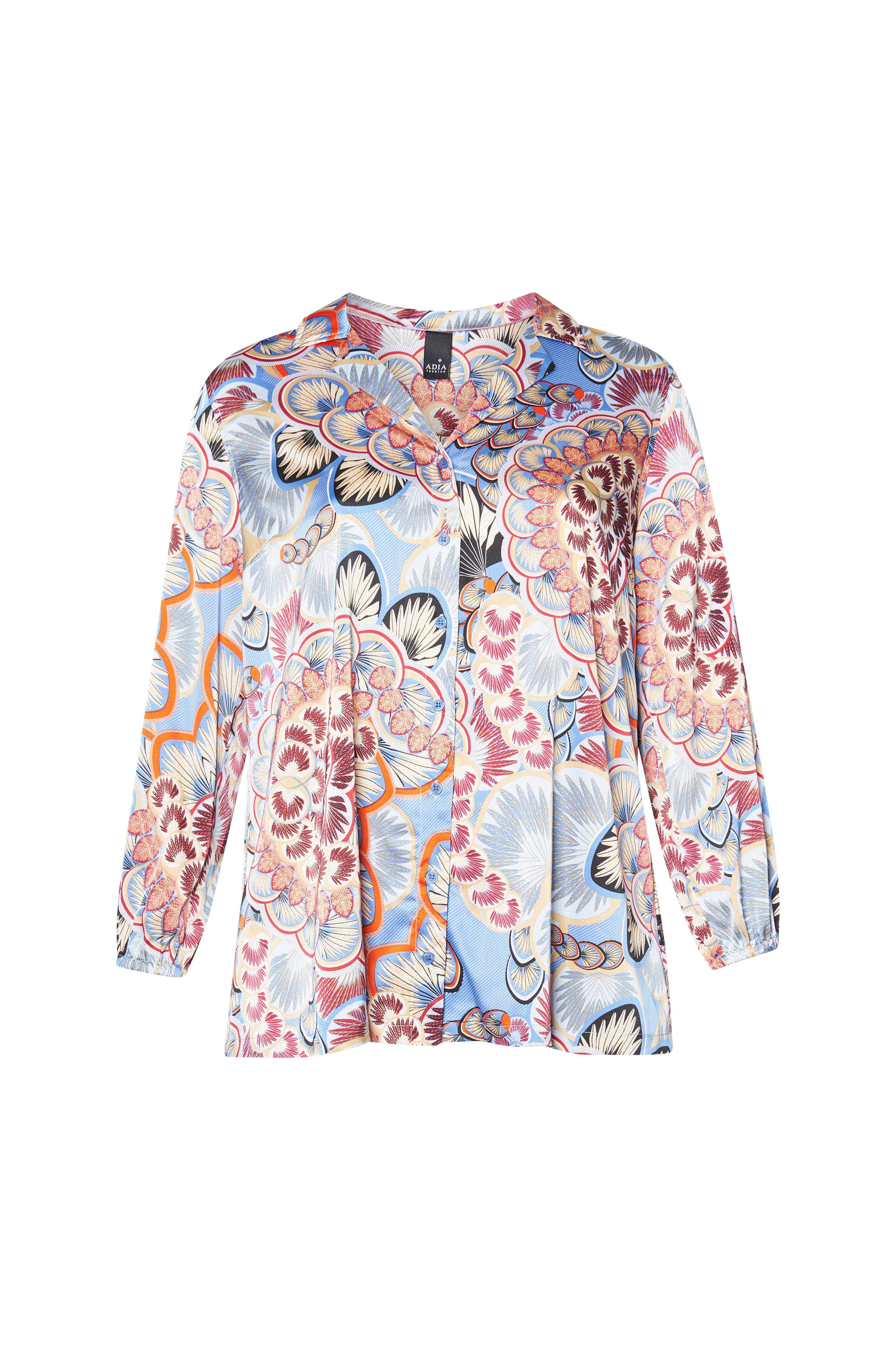 • Skinnende stof med printet mønster• V-udskæring• Knapper• Elastisk bånd ved manchetterne