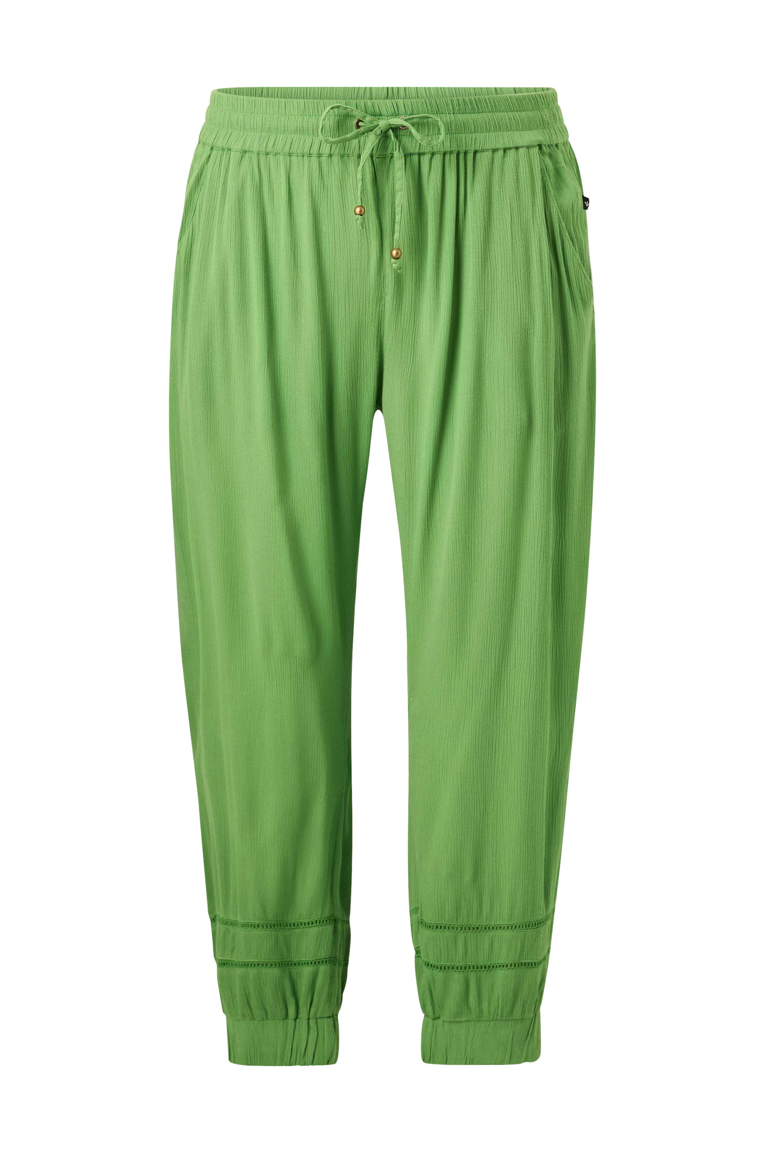 • Bukser i viskose• Elastisk talje med træksnørre• Sidelommer• Hulbroderier på benene• Elastikmanchetter ved enden af benene• Store størrelser