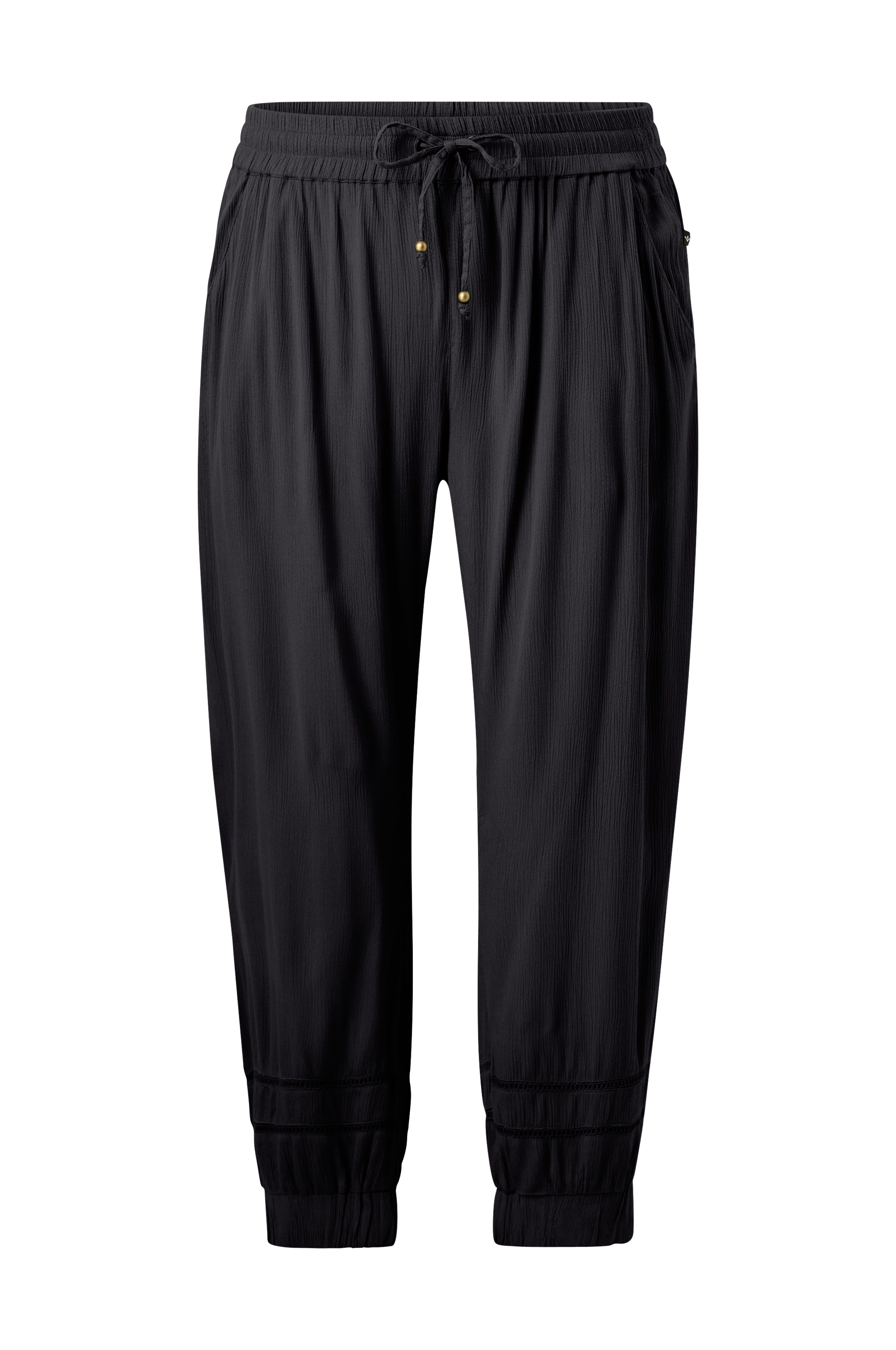 • Bukser i viskose• Elastisk talje med træksnørre• Sidelommer• Hulbroderier på benene• Elastikmanchetter ved enden af benene• Store størrelser