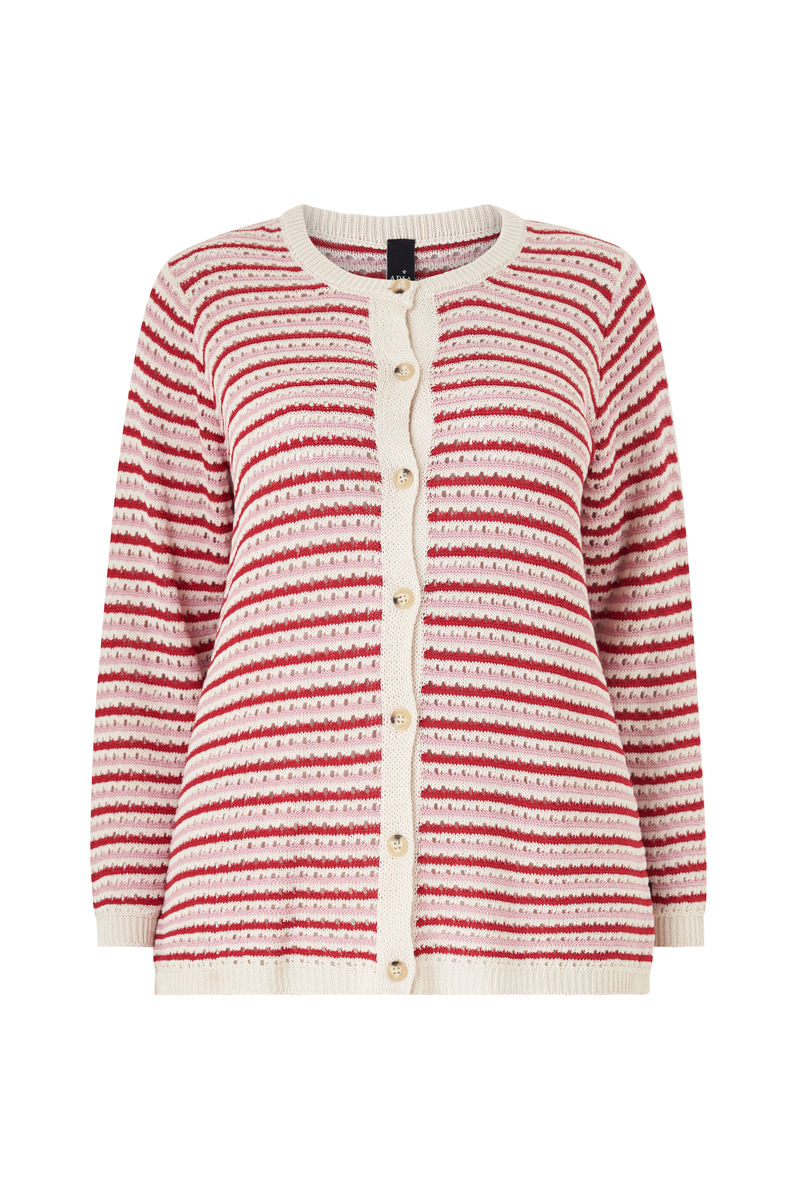 • Store størrelser• Lige, mønsterstrikket model• Rund hals• Knapper foran• Langt ærme• Ribstrikkede kanter