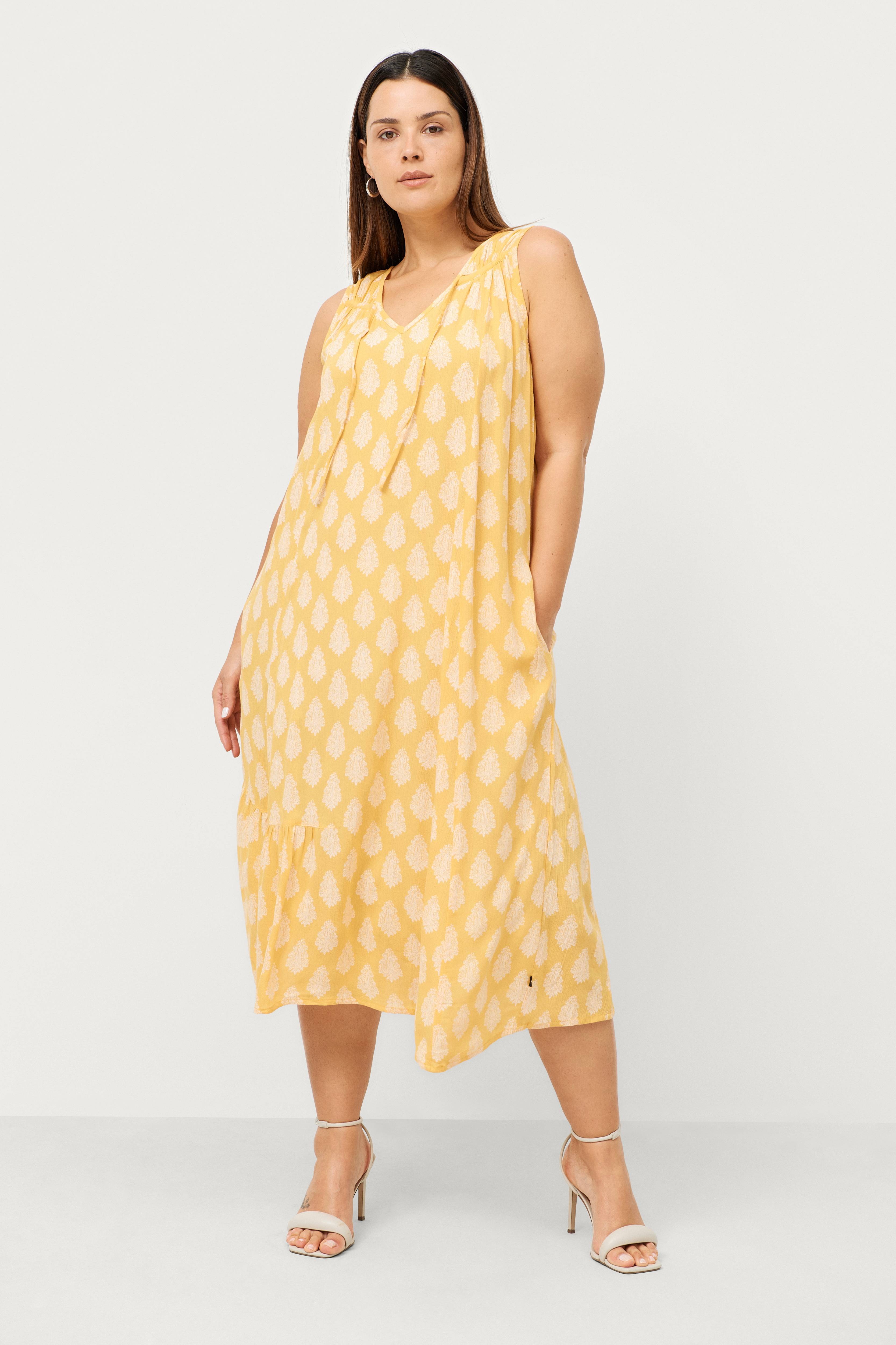 • Ærmeløs midikjole• V-udskæring med bindebånd foran• Lommer i siderne• Let krøllet kvalitet• Længde: 125 cm i størrelse S