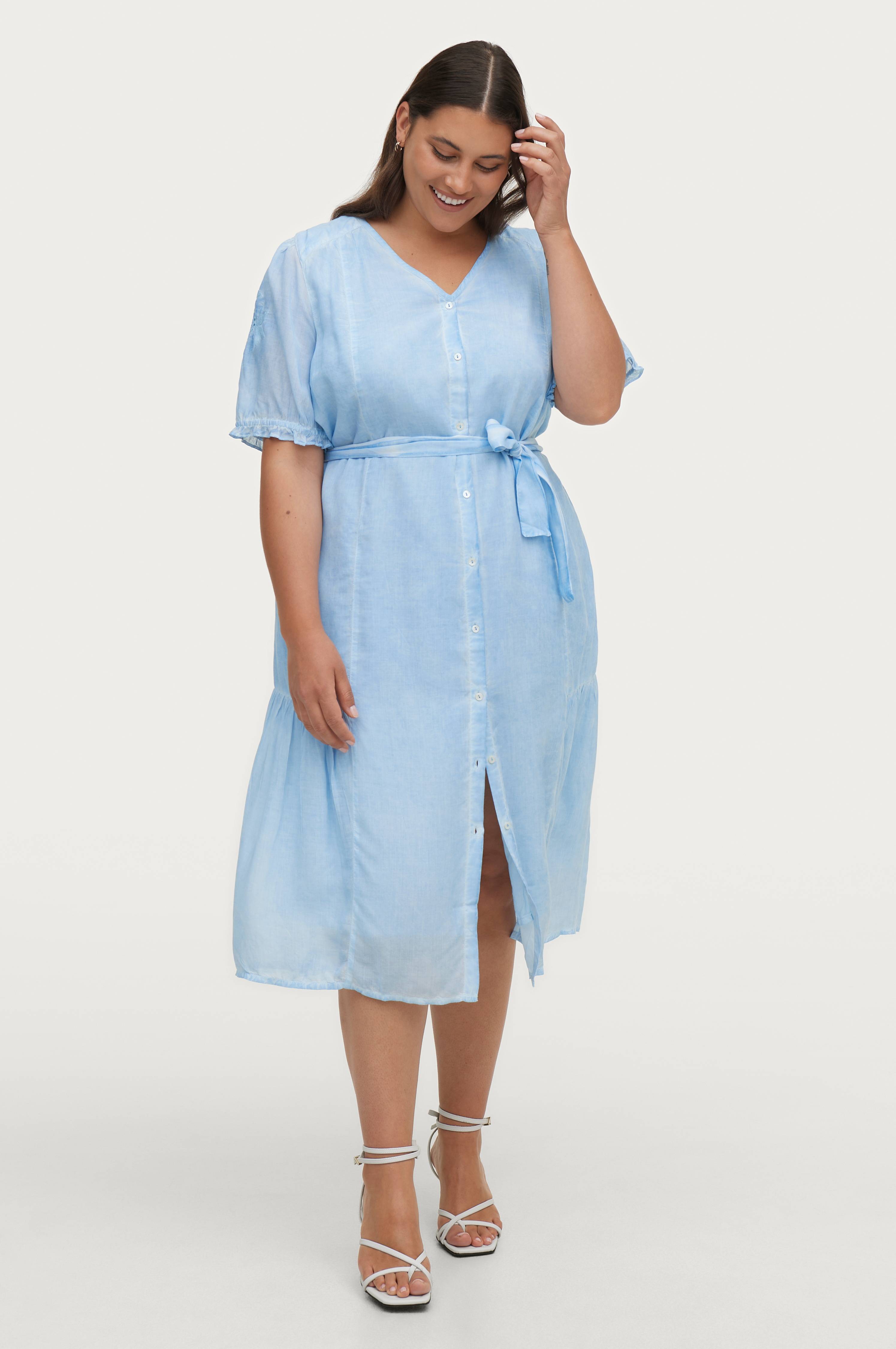 • A-linje design• Korte ballonærmer med hulbroderi• V-udskæring• Knapper foran• Lommer i siderne• Bæltespænde ved taljen• Rynket søm på skørtet• Længde: 118 cm i størrelse S