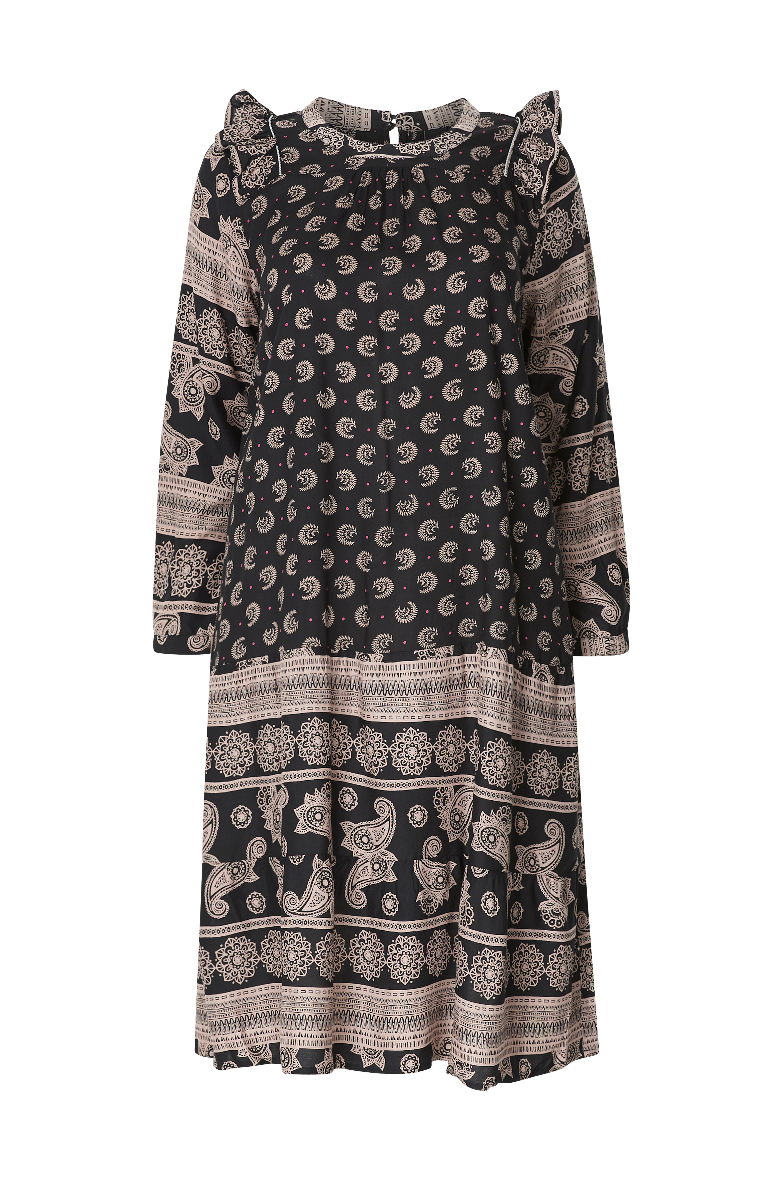 • Midikjole i viskose• A-linje design• Volanter på skuldrene• Lange ærmer med tynd manchet• Ventilation med knap i nakken• Store størrelser• Længde: 122 cm i størrelse S