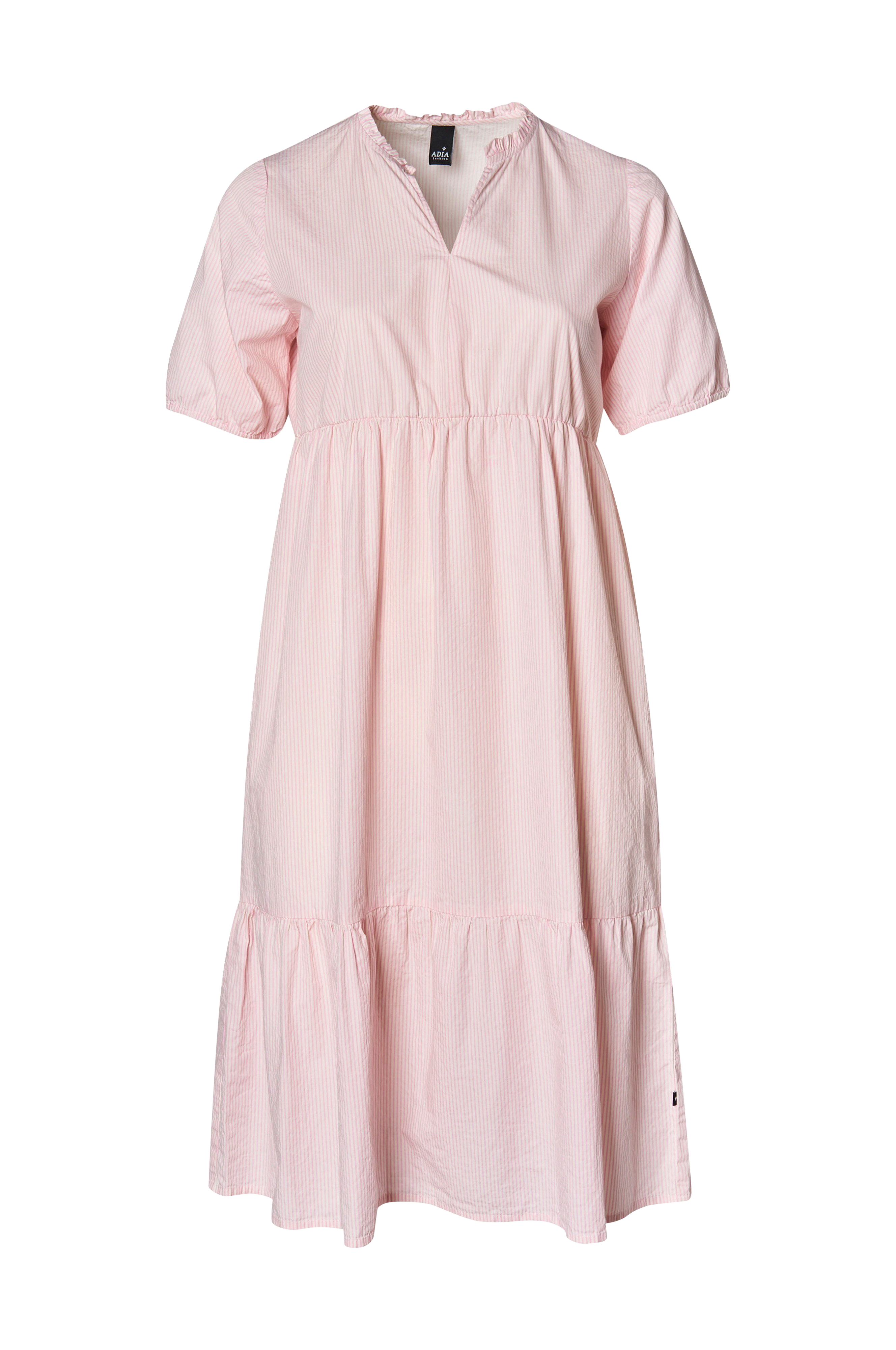 • Store størrelser• Model med svaj• Halsudskæring med lille volantnederdel og ventilation foran• Kort ærme med elastik ved manchetterne• Rynket, elastisk talje• Bred volant ved nederste kant• Længde: 122 cm i størrelse 42/44