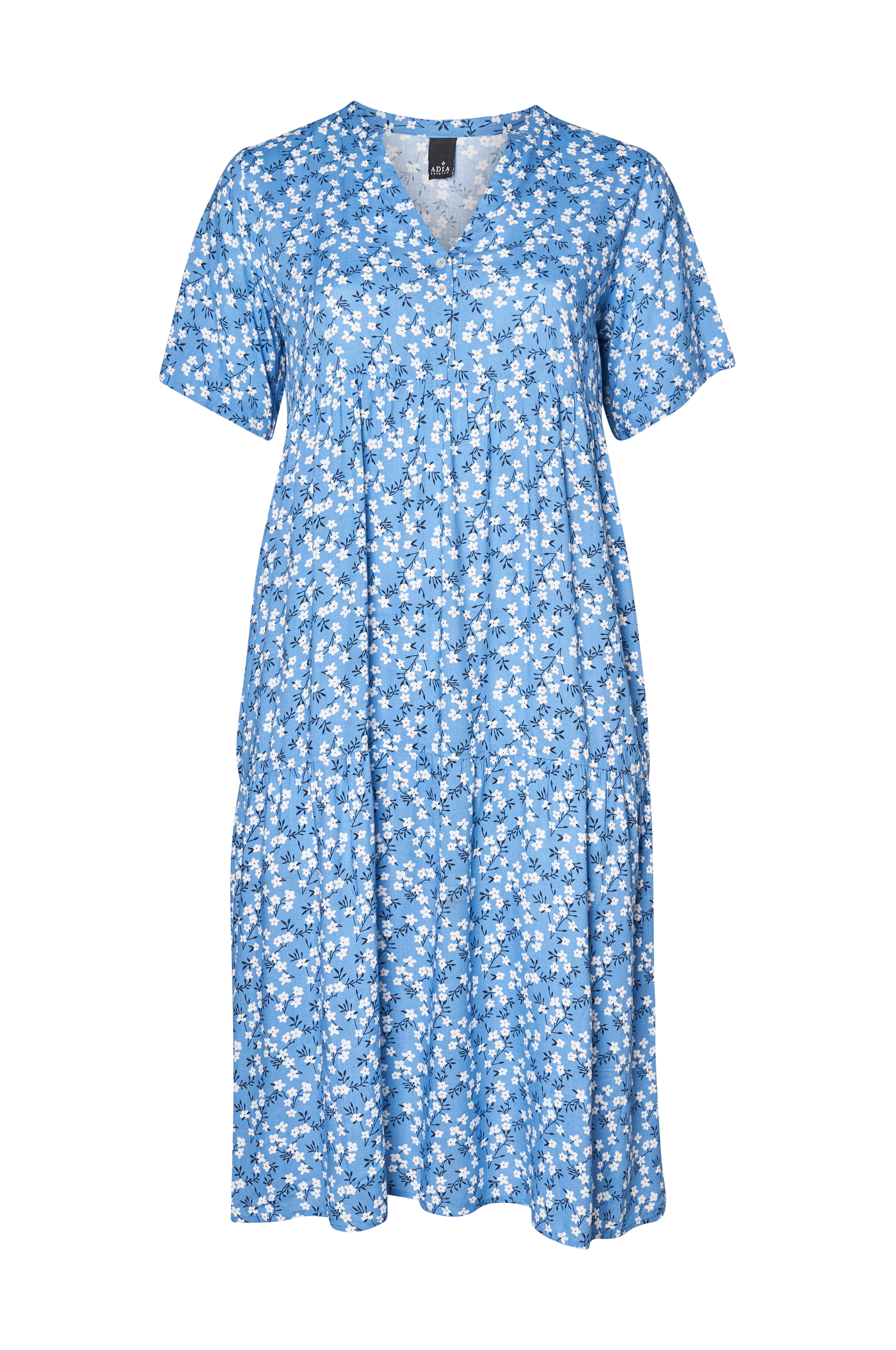 • Store størrelser• Model med svaj• Rund hals med ventilation foran og kort knaplukning foran• Kort ærme• Rynket talje• Længde: 122 cm i størrelse 42/44