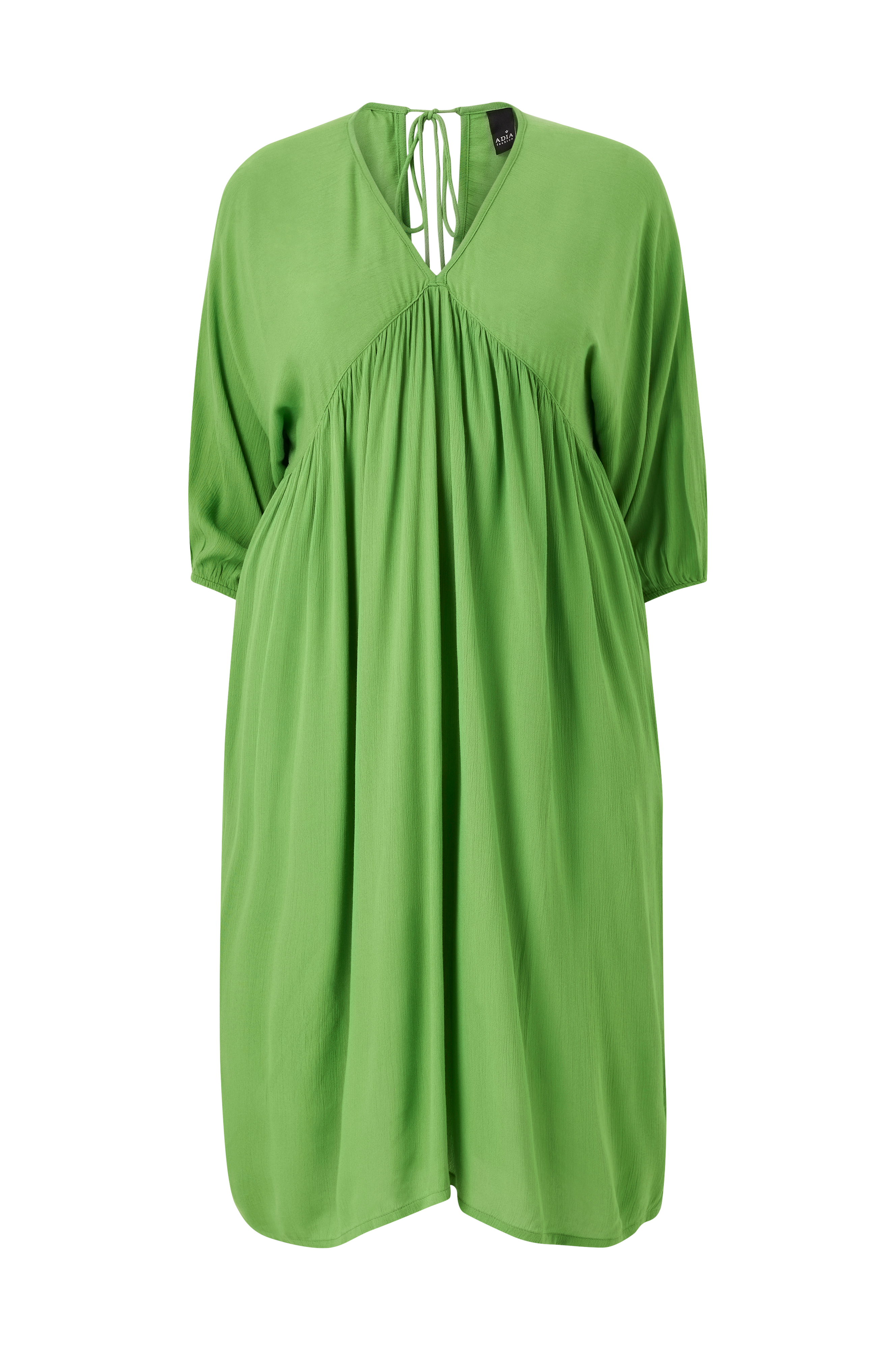 • V-udskæring• Samling ved brystet• Åbning med bindebånd med kvaster i nakken• 3/4 lange ærmer• Rynket kvalitet• Store størrelser• Længde: 112 cm i størrelse S