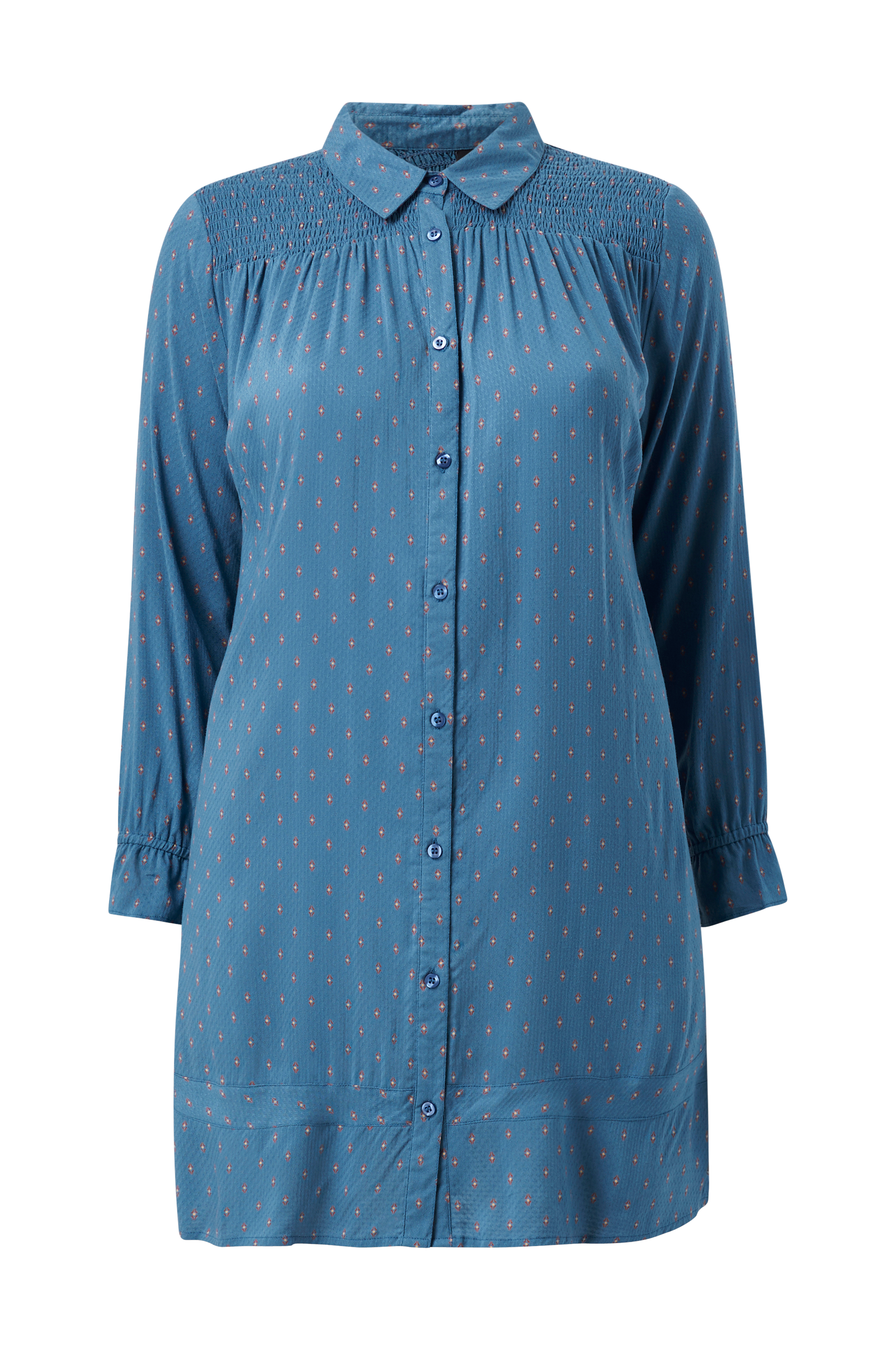 • Store størrelser• Knapper foran• Smock på toppen• Langt ærme med volant ved manchetterne