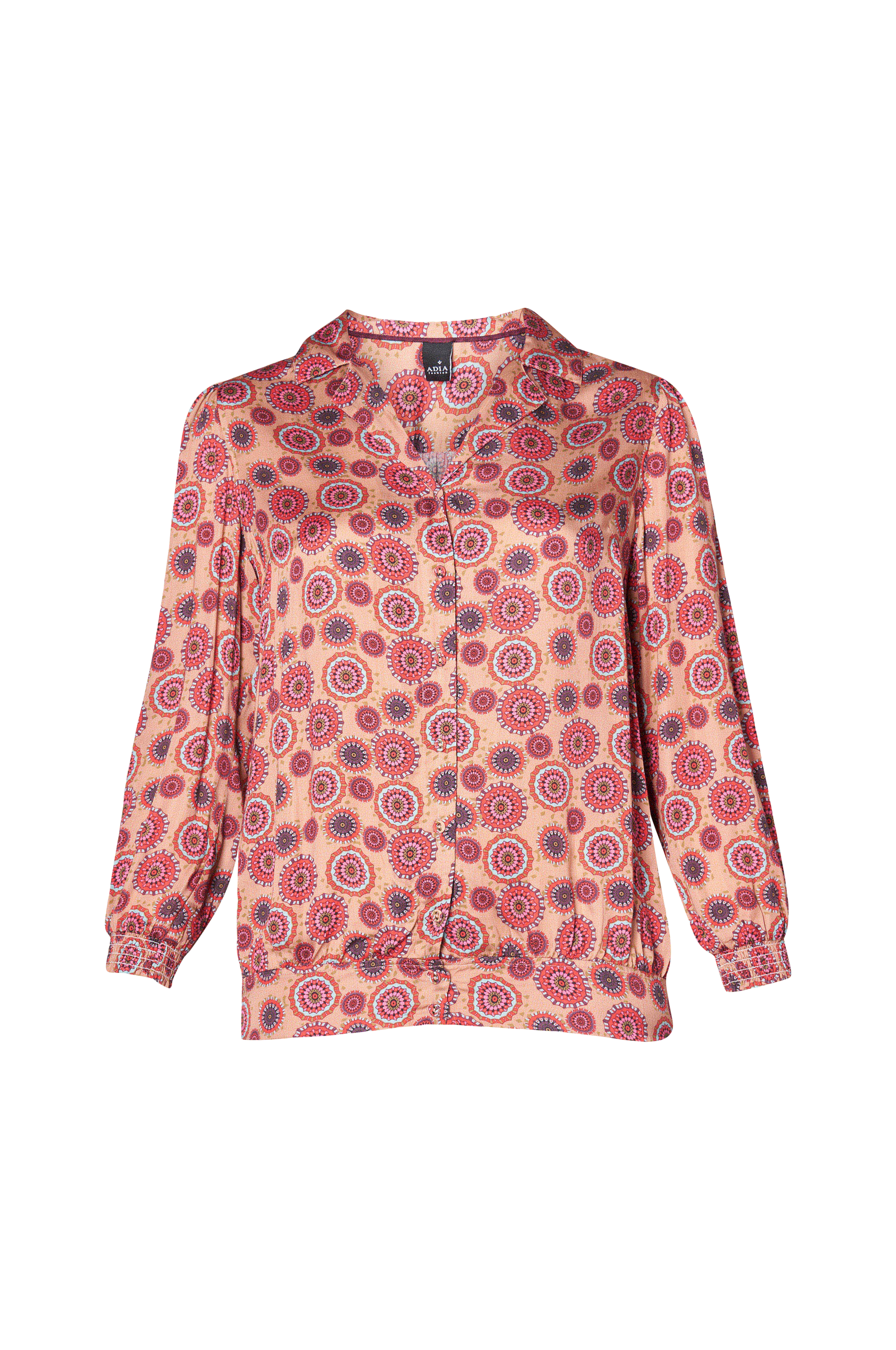• Mønstret skjorte med glans• V-udskæring med krave• Knapper foran• Smock ved manchetterne og nederst