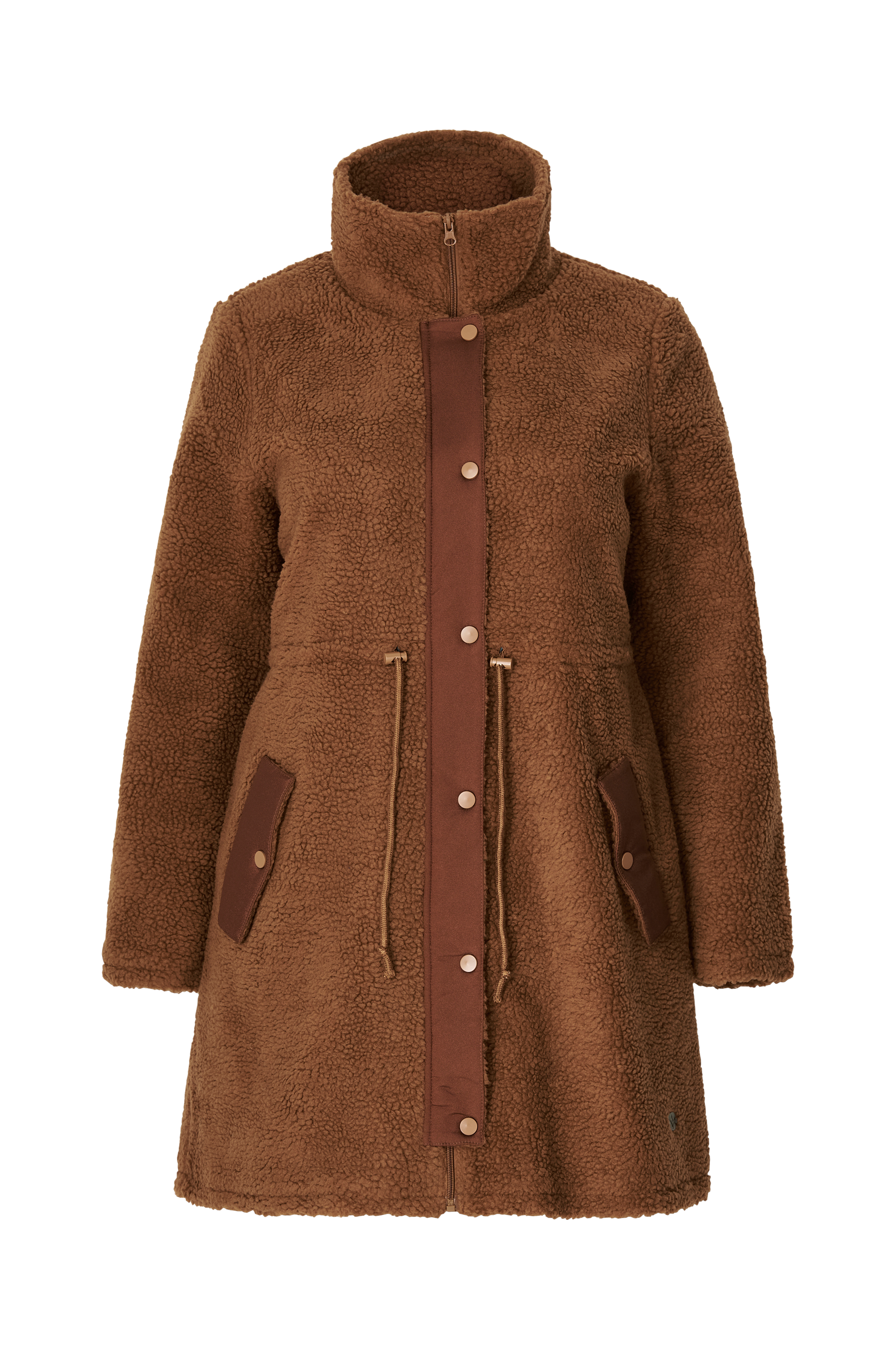 • Store størrelser• Jakke i teddy• Lynlås med vindflap og trykknapper foran• Ståkrave• Træksnørre ved taljen• To lommer• En inderlomme• Vævet for• Længde: 95 cm i størrelse 42