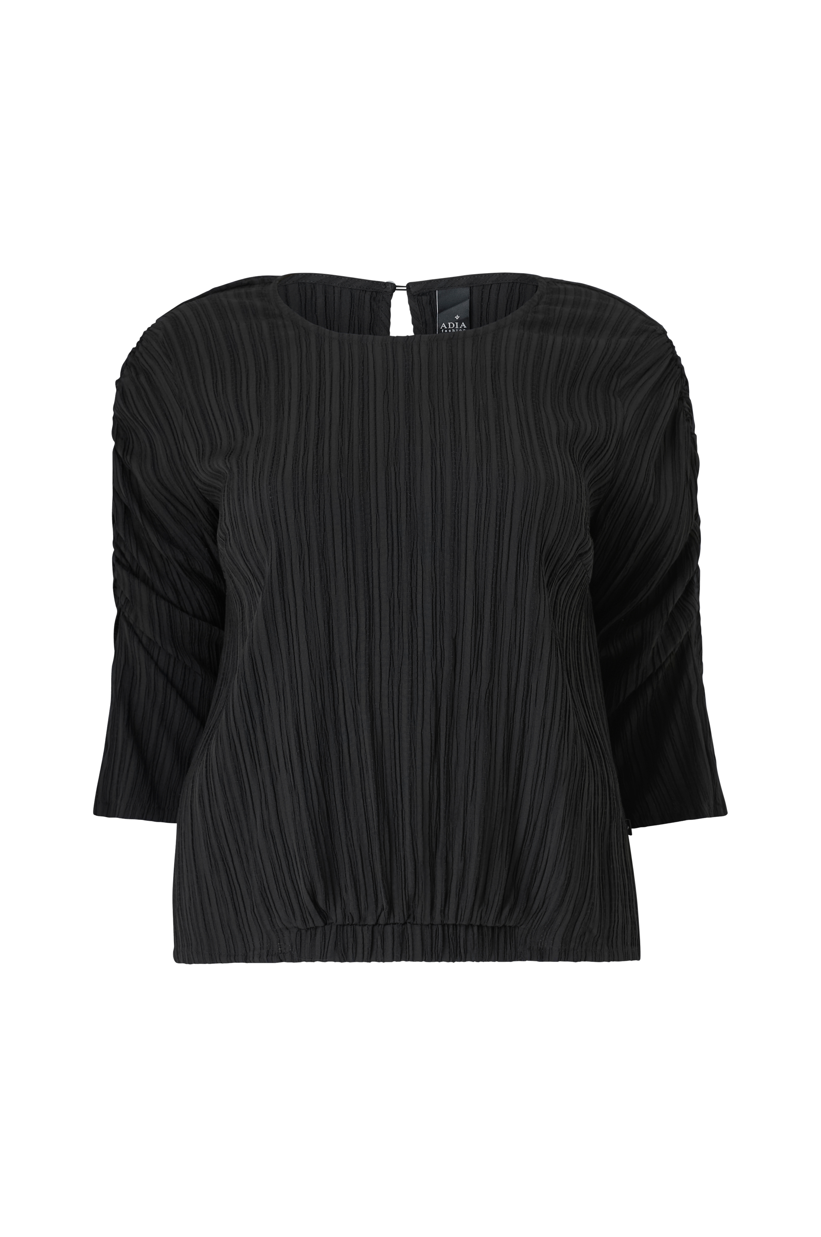 • Store størrelser• Uformel, mønstervævet model• Rund hals med knap i nakken• 3/4 langt ærme med elastisk drapering på oversiden• Søm med indlagt elastik midt foran og midt bagpå