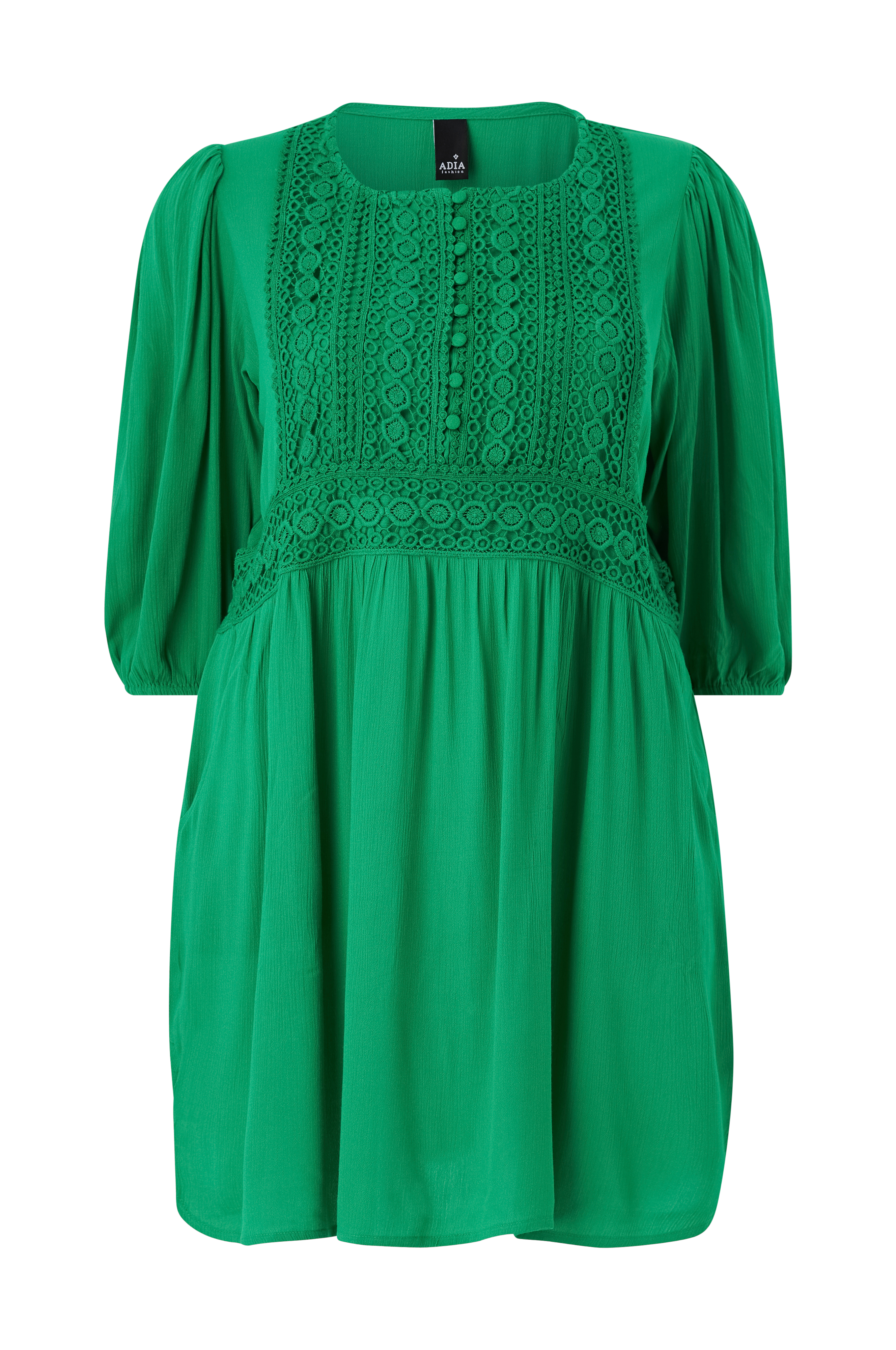 • Store størrelser• Uformel model i crepe med påsyet blonde• Rund hals• Kort knaplukning foran med beklædte knapper• 3/4 langt ballonærme med elastik ved manchetterne• Lommer• Afrundede, korte slidser• Længde: 91 cm i størrelse 42/44