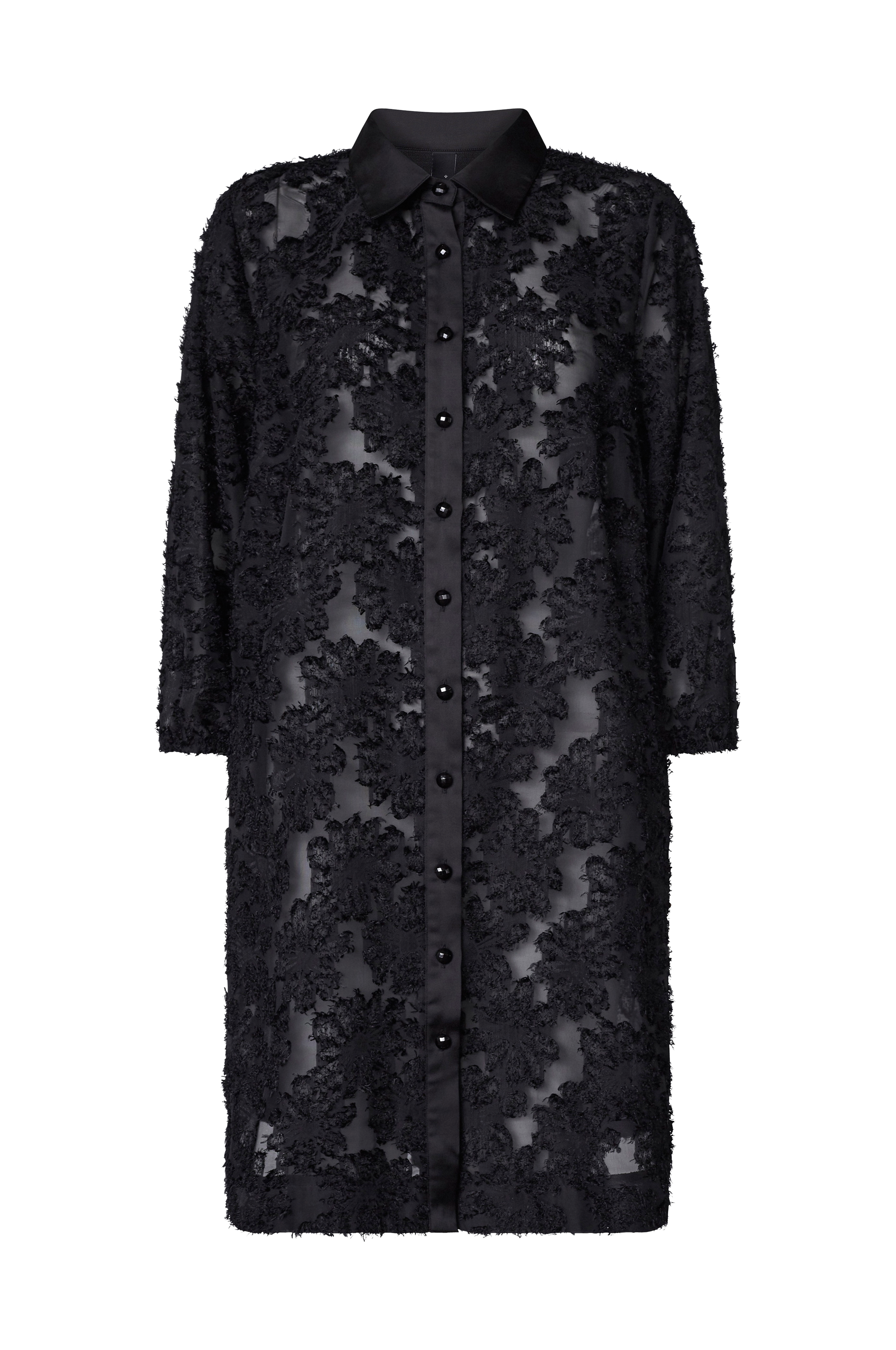 • Semitransparent tunika med skjortemodel• Blomsterapplikationer hele vejen rundt• 3/4 lange ærmer• Afrundet søm• Plusstørrelser• Længde: 93 cm i størrelse S