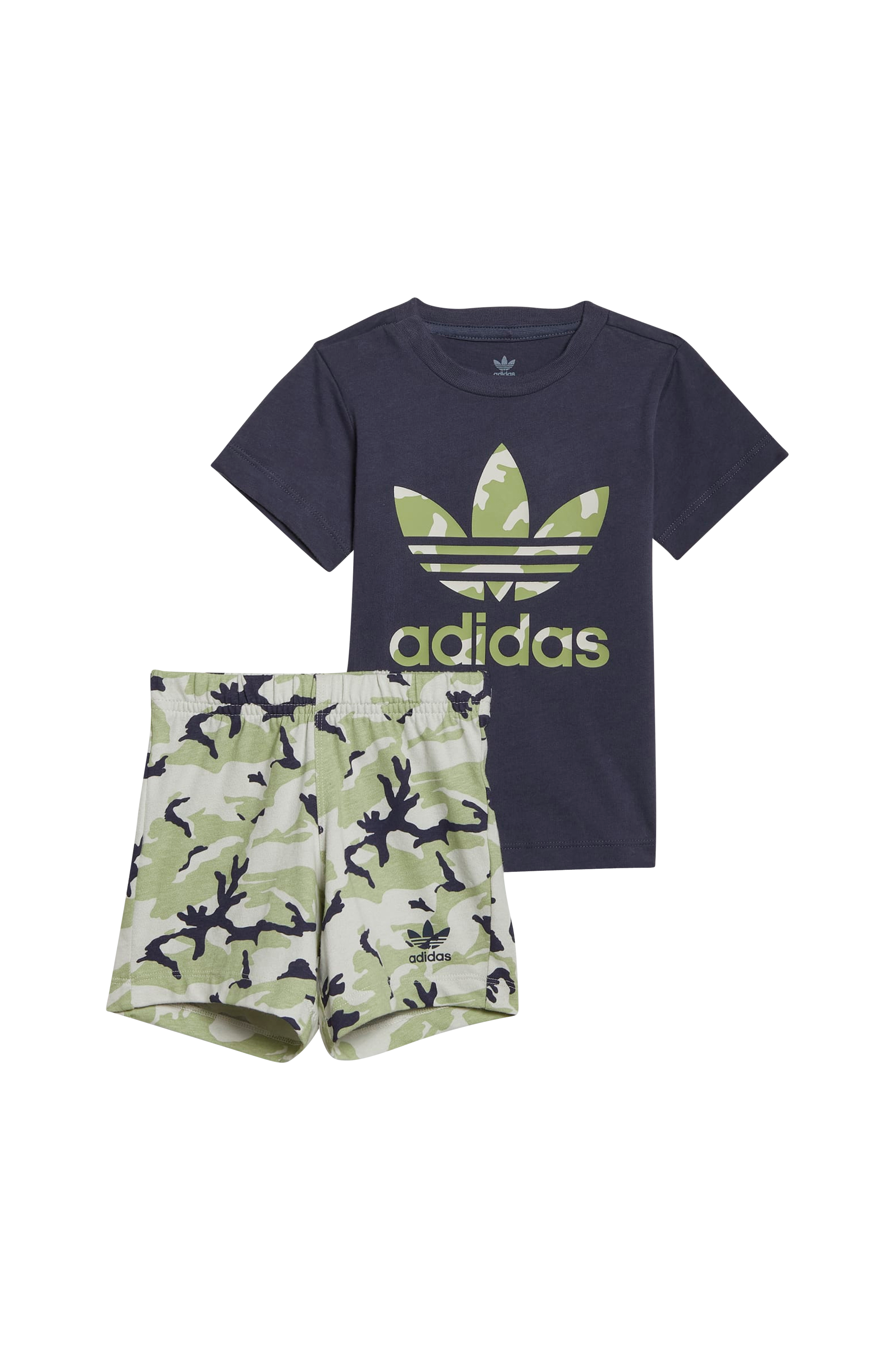 Sæt med T-shirt og shorts. T-shirten har rund hals med trykknapper på skulderen (op til størrelse 86). Shortsene har en elastisk talje med løbegang.