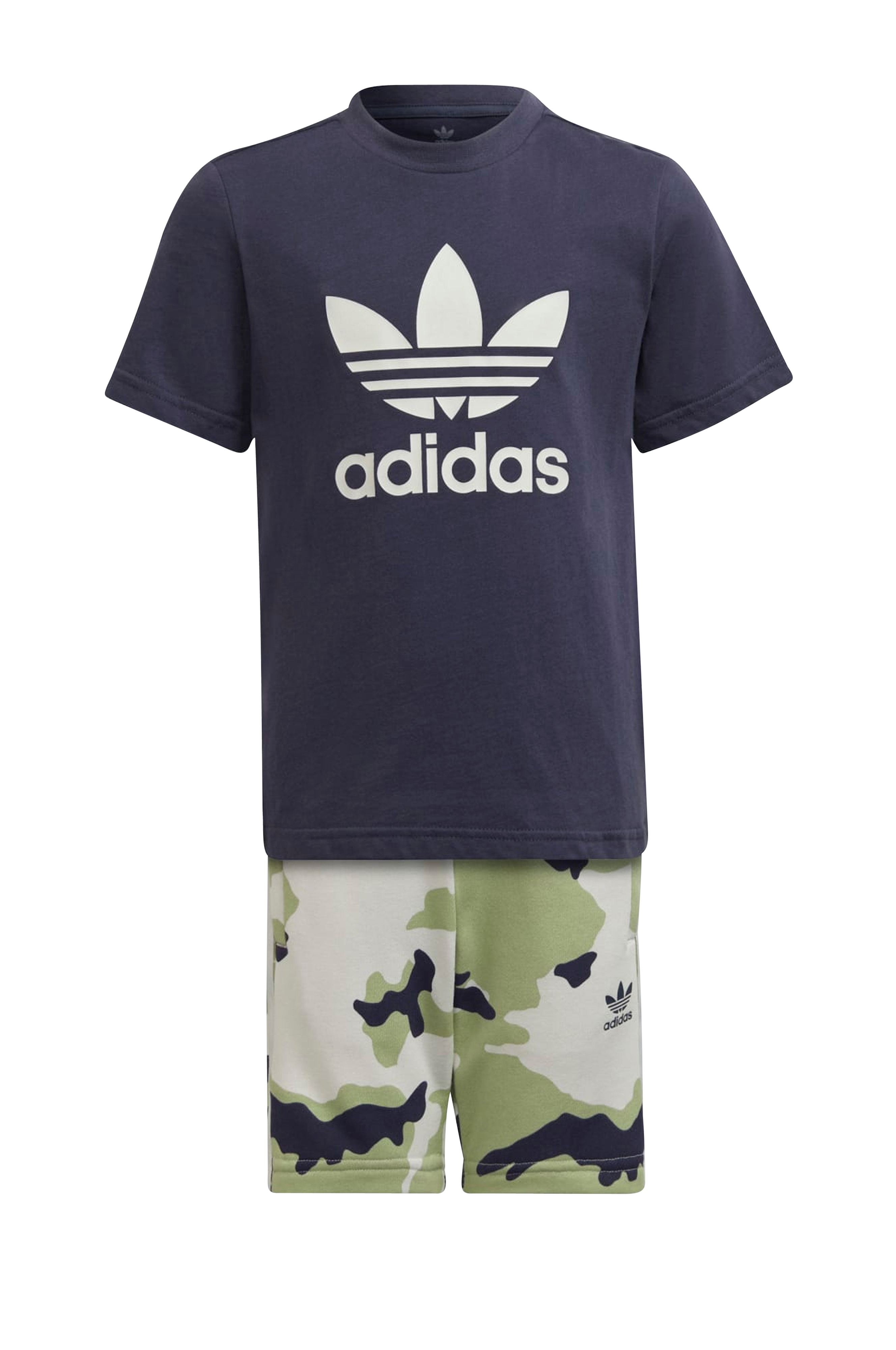 Sæt med t-shirt og shorts i blød jersey. T-shirten har rund, ribbet halsudskæring og printet logo foran. De mønstrede shorts har elastisk linning med løbegang og to lommer med lynlås.