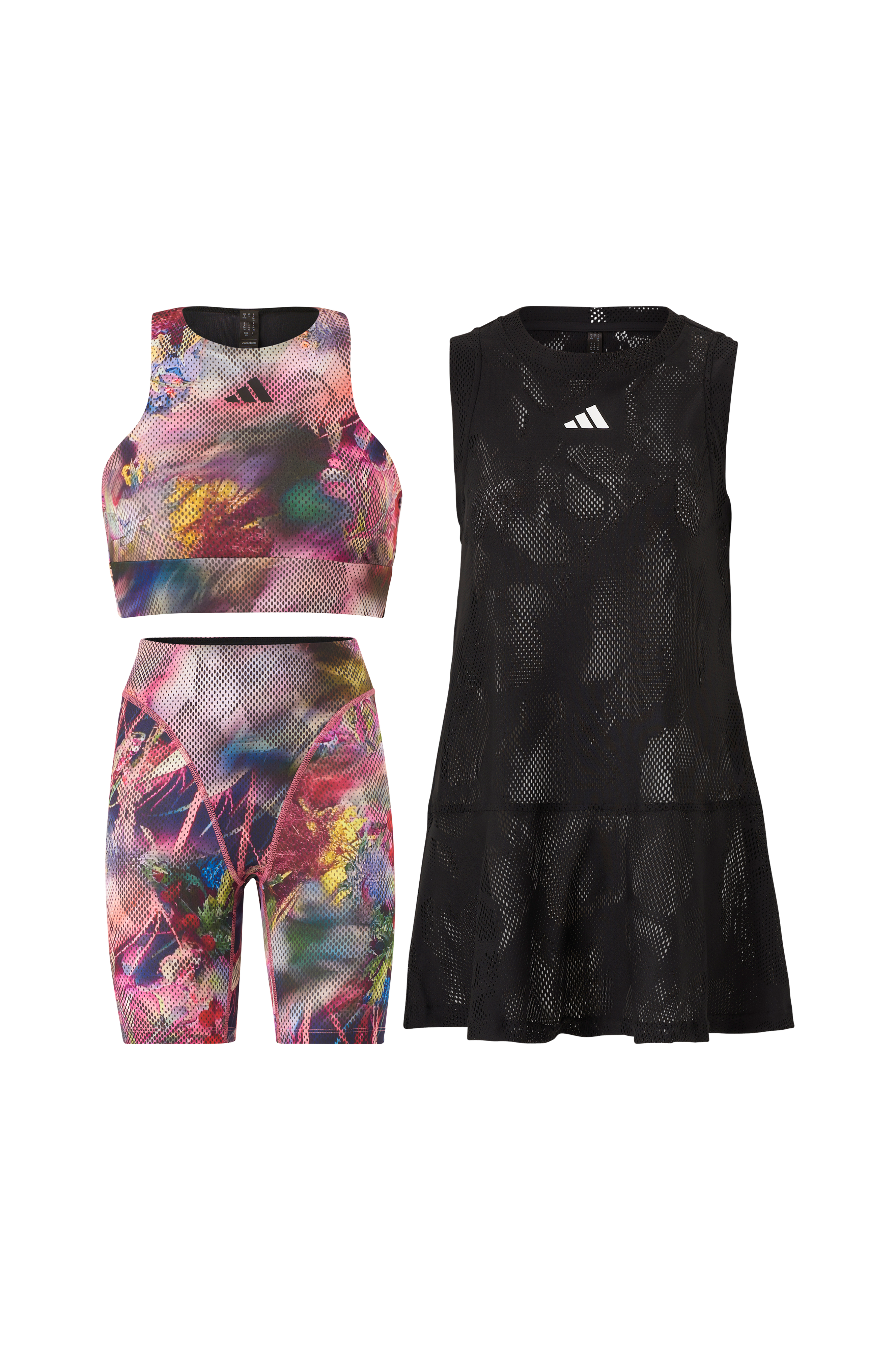 Ærmeløs kjole med sports-bh og korte tights.Kjole: meshmateriale med fugtabsorberende AEROREADY.Sports-bh: Stretchjersey og bryderryg med powermesh.Tights: Stretchjersey, elastisk talje og meshforet forstykke. Skridt med dobbelte lag.