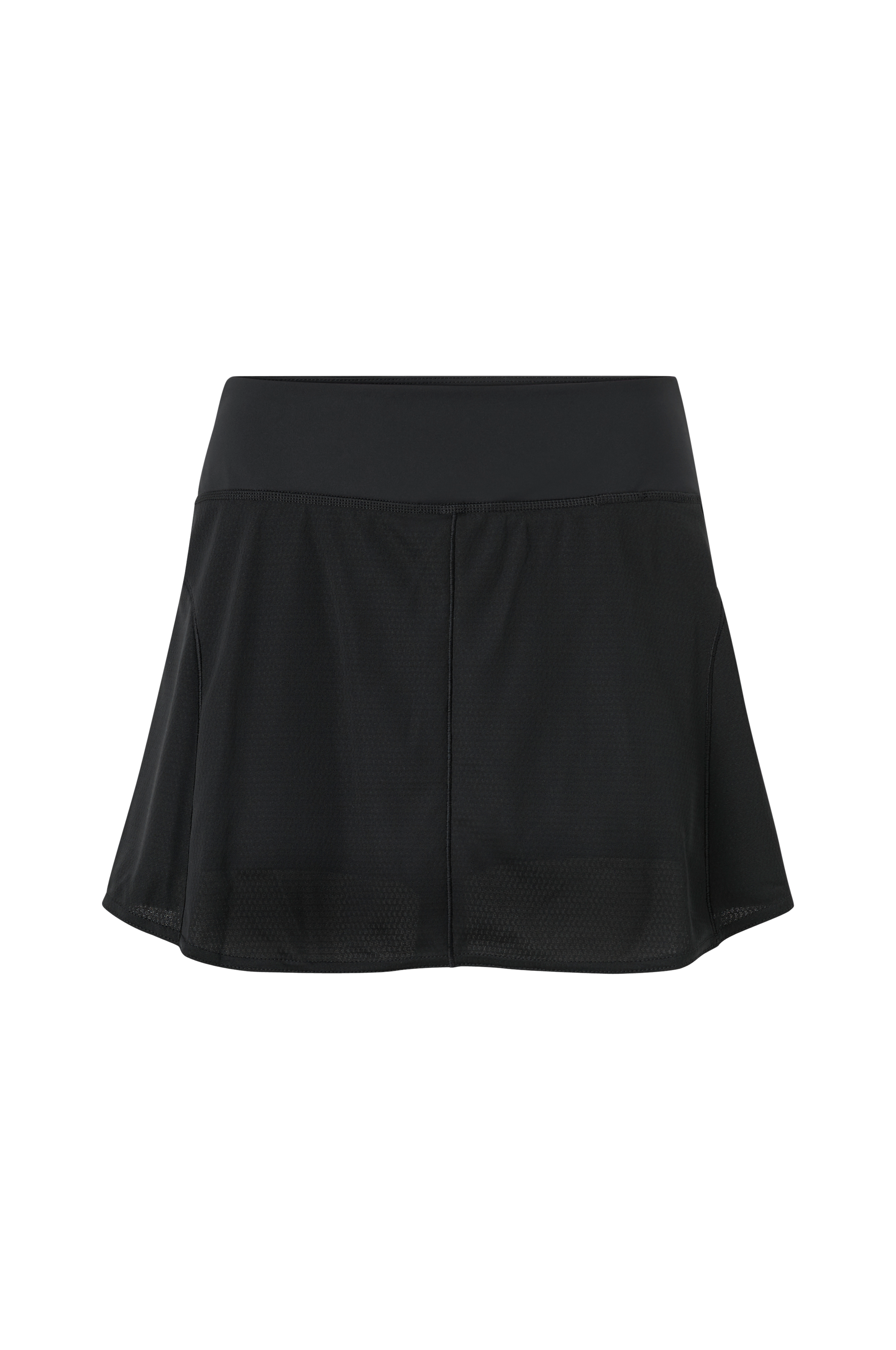 Padelnederdel/tennisnederdel med indbyggede tights. Stretchjersey med bred og blød linning, Kort, noget A-formet model med læg i siderne.