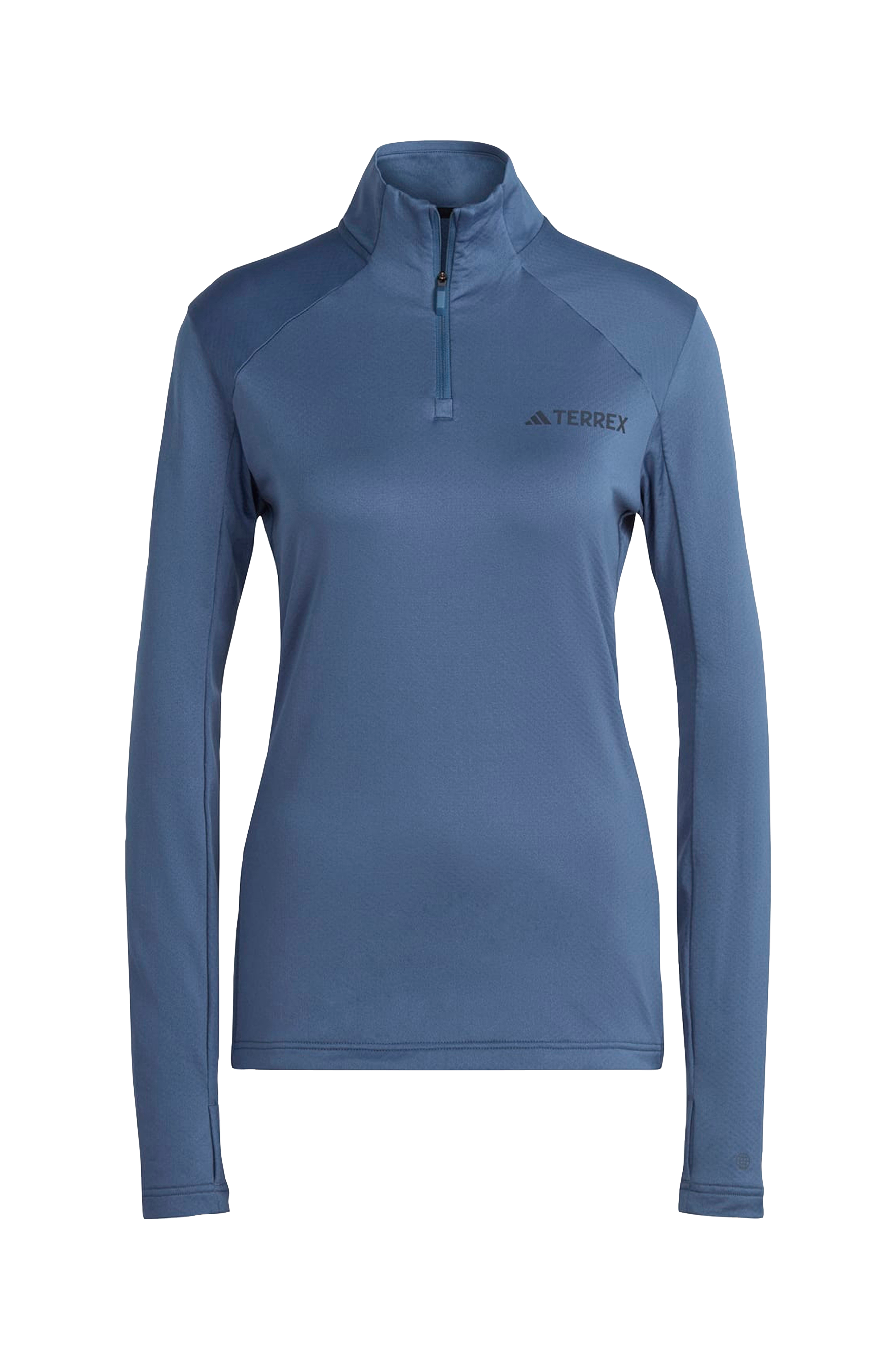 Funktionstrøje i blødt stretchmateriale med inderside i blød fleece med vaffelstruktur. Høj krave og kort lynlås foran. Reflekslogo på brystet. Noget længere bagpå.