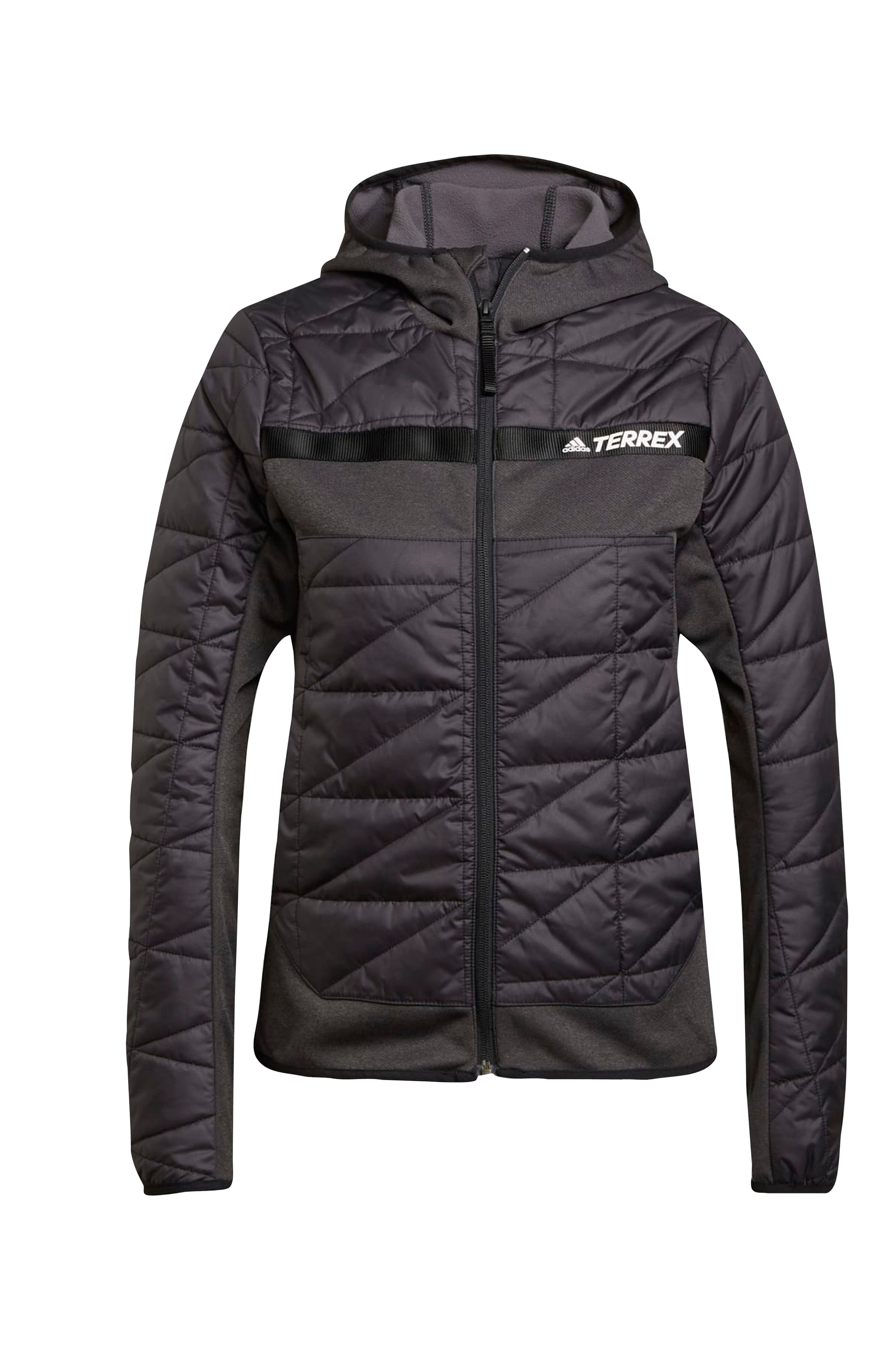 Hybridjakke med varme og ventilation i ét. Hybriddesignet med bodymapping-teknologi lader kroppen ånde og få luft der hvor behovet er størst. Materiale med AEROREADY absorberer fugt for en tør følelse. Den quiltede, syntetiske vattering holder på varmen.