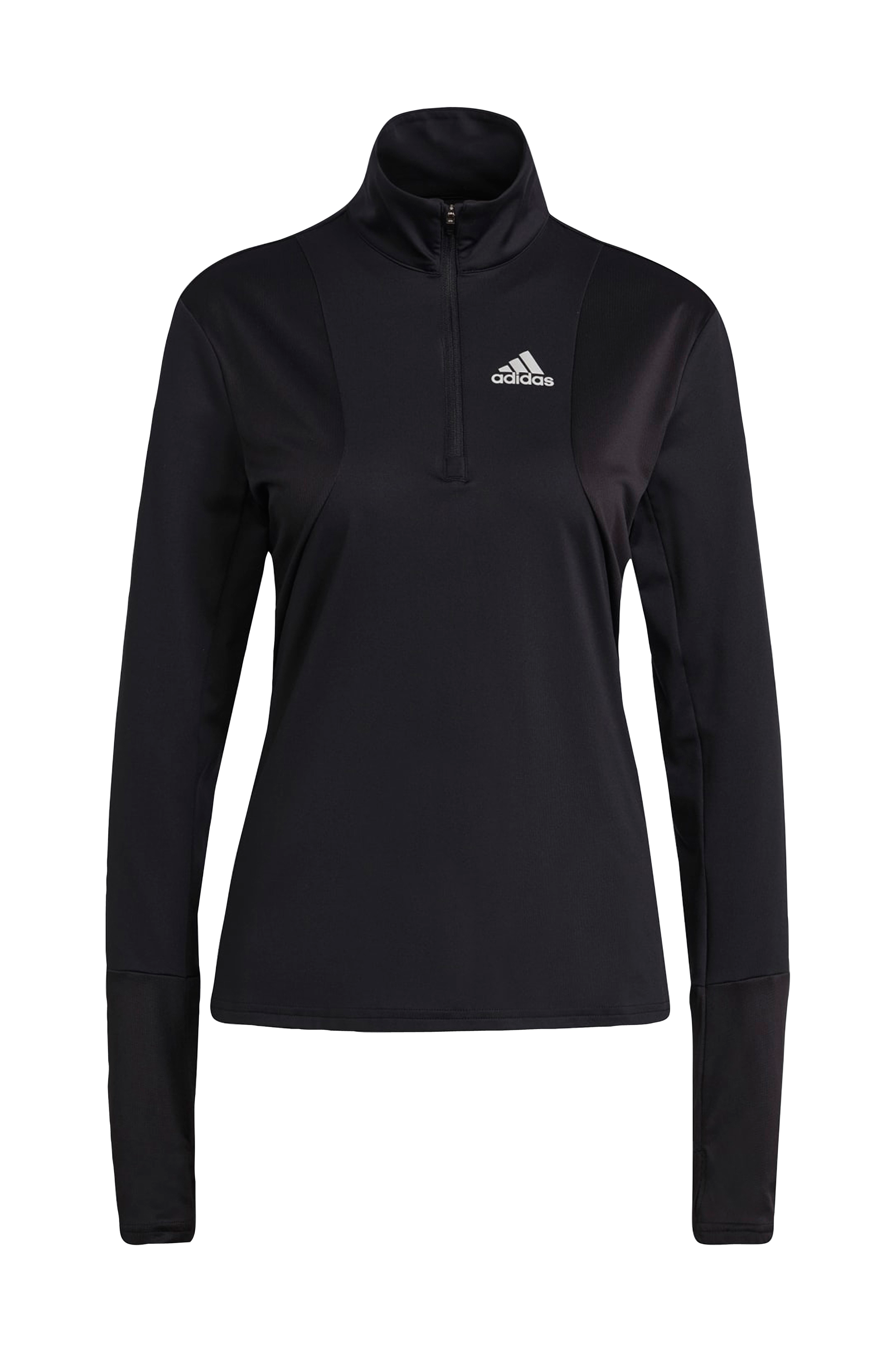 En varm løbetrøje med halvlang lynlås, fremstillet i ventilerende materiale med stretch og fugtabsorberende AEROREADY. Standkrave og hul til tommelfingeren i ærmekanten. Refleksdetaljer hele vejen rundt.