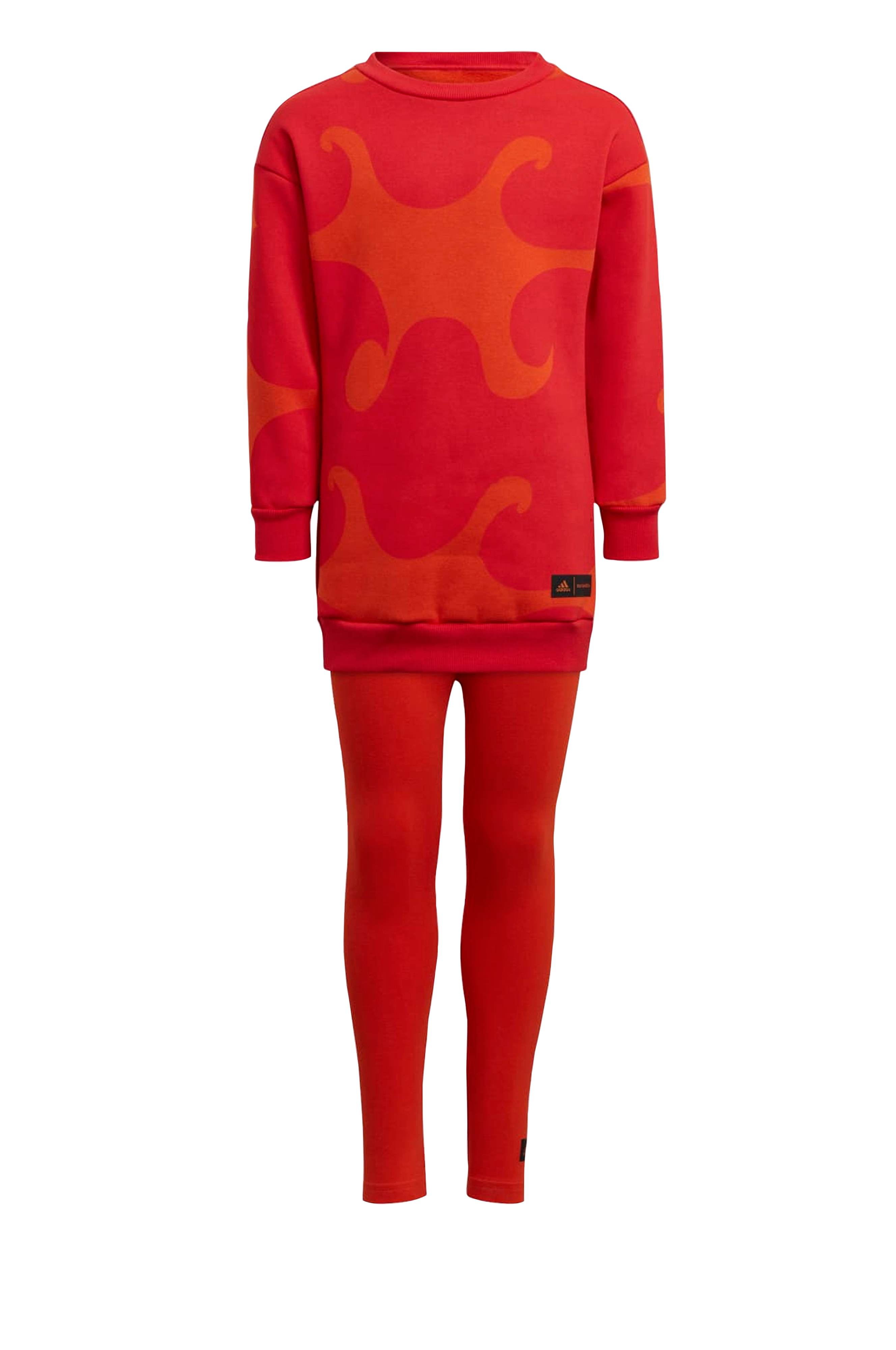 2-delt sæt med sweatshirt i ekstra lang model og bukser med smal pasform. Sweatshirten har blød, børstet inderside, printet Marimekko-mønster og rund halsudskæring. Bukserne er i stretchjersey med elastisk talje.