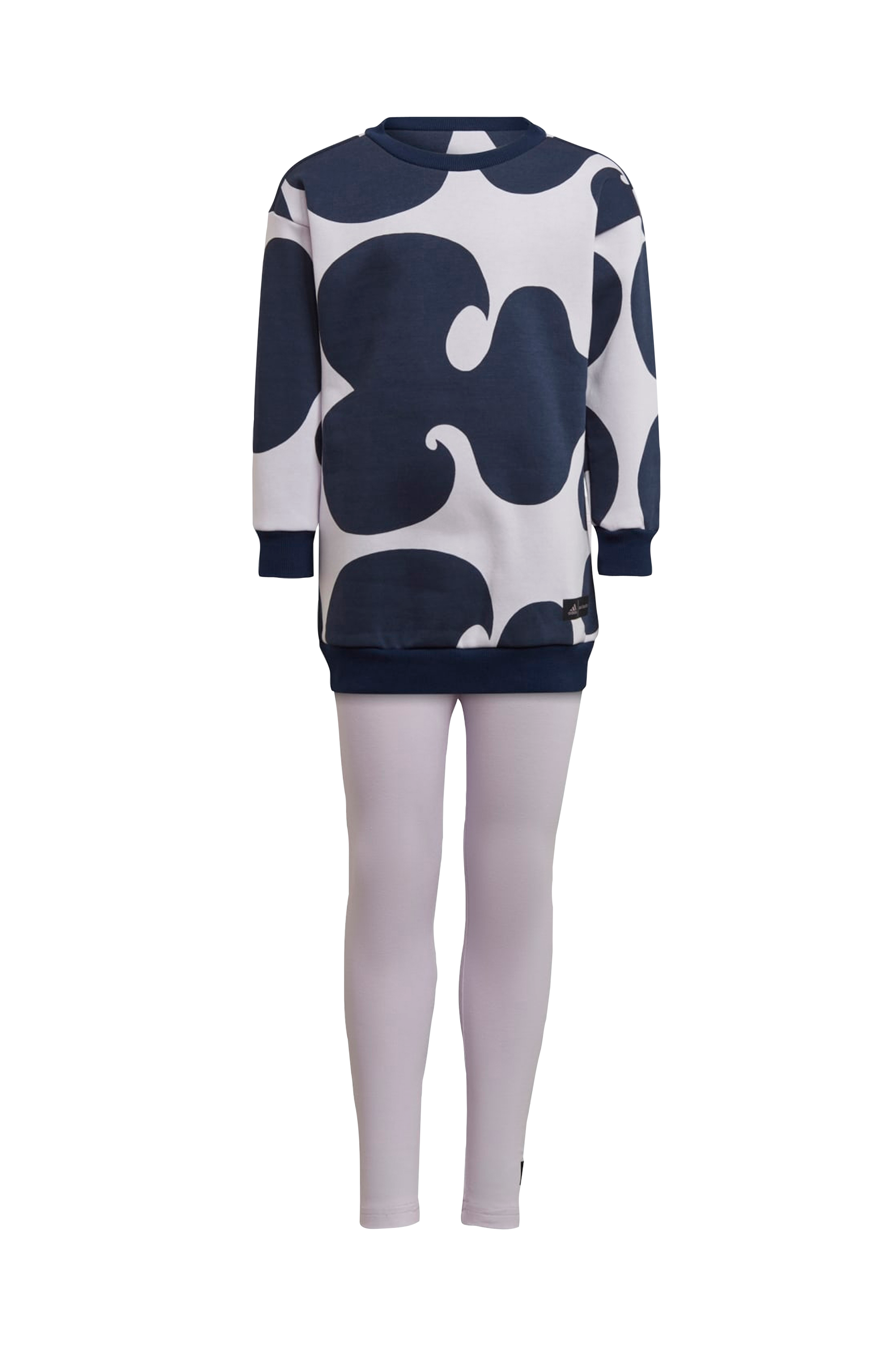 2-delt sæt med sweatshirt i ekstra lang model og bukser med smal pasform. Sweatshirten har blød, børstet inderside, printet Marimekko-mønster og rund halsudskæring. Bukserne er i stretchjersey med elastisk talje.