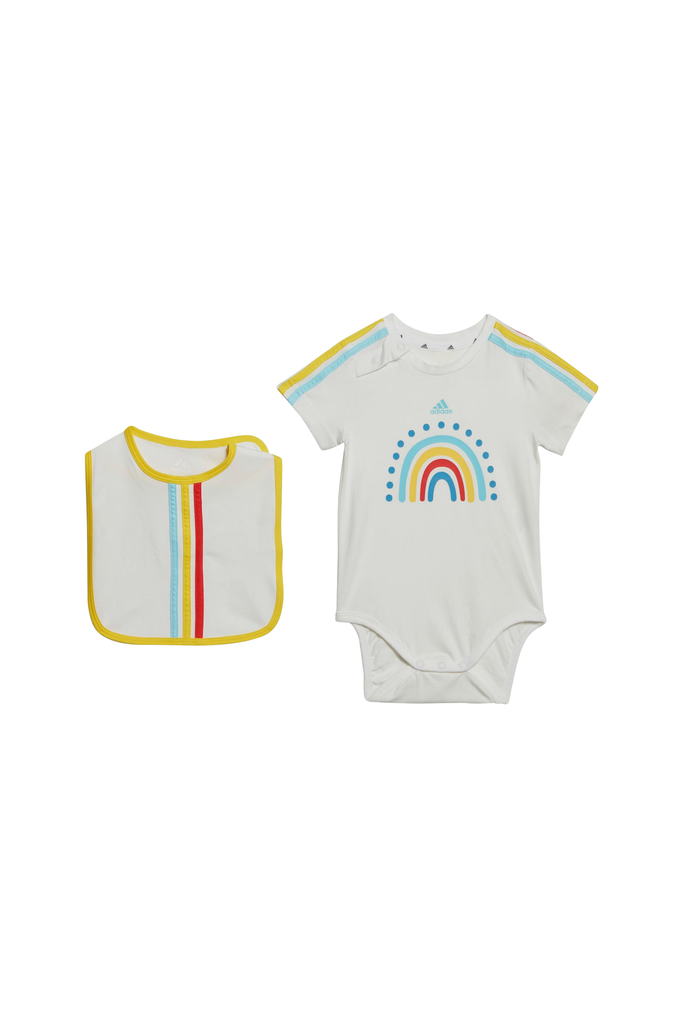 2-delt sæt med body og hagesmæk. Af blød bomuldsjersey med stretch.Kortærmet body med rund halsudskæring. Trykknapper på den ene skulder og i skridtet. Hagesmæk med trykknap.