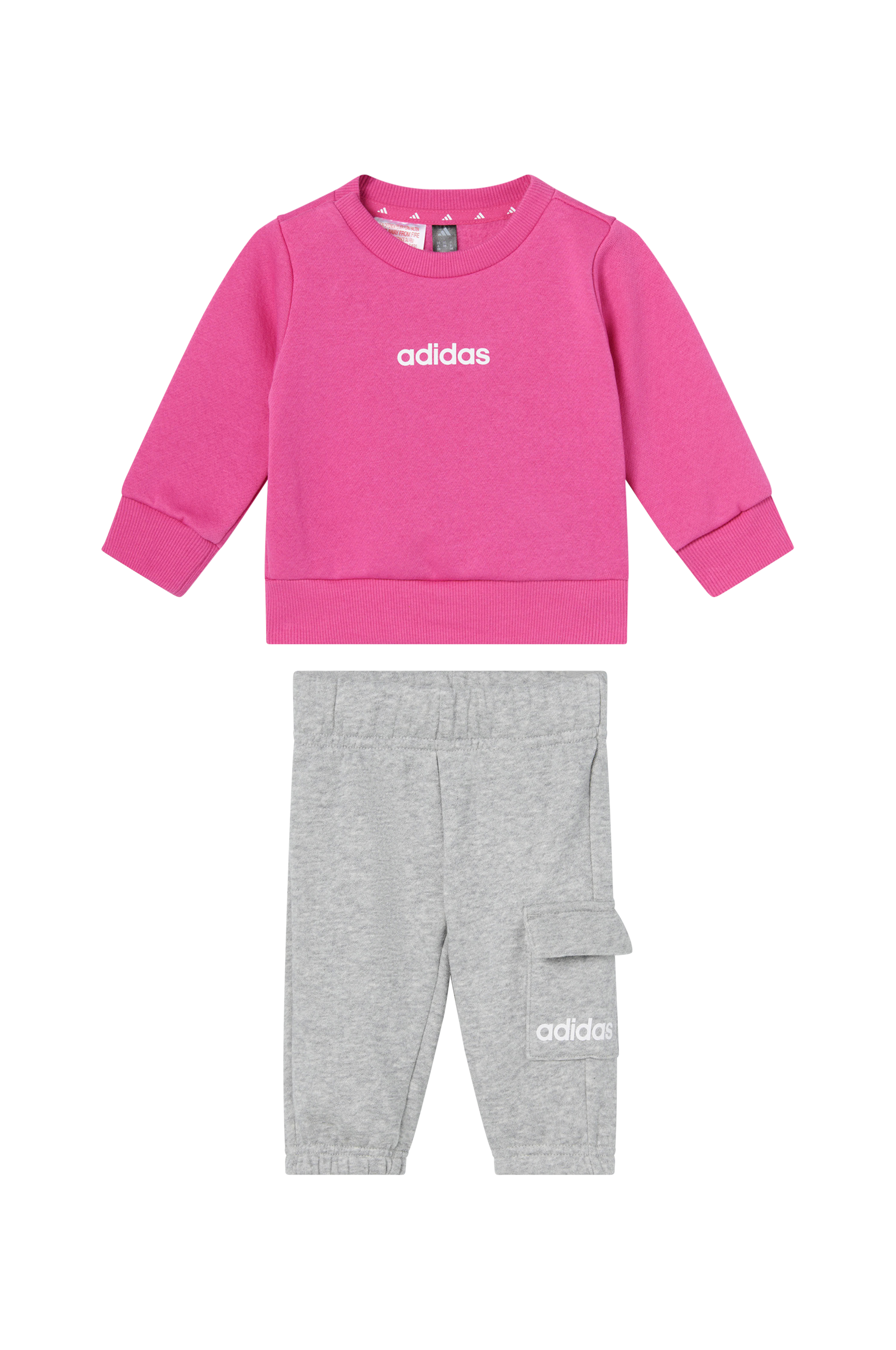 • 2-delt babysæt med sweatshirt og træningsbukser• Blød, børstet inderside• Trykknapper på en skulder• Ribmanchetter ved manchetterne og nederst• Træningsbukser med elastisk talje og elastik ved enden af benene