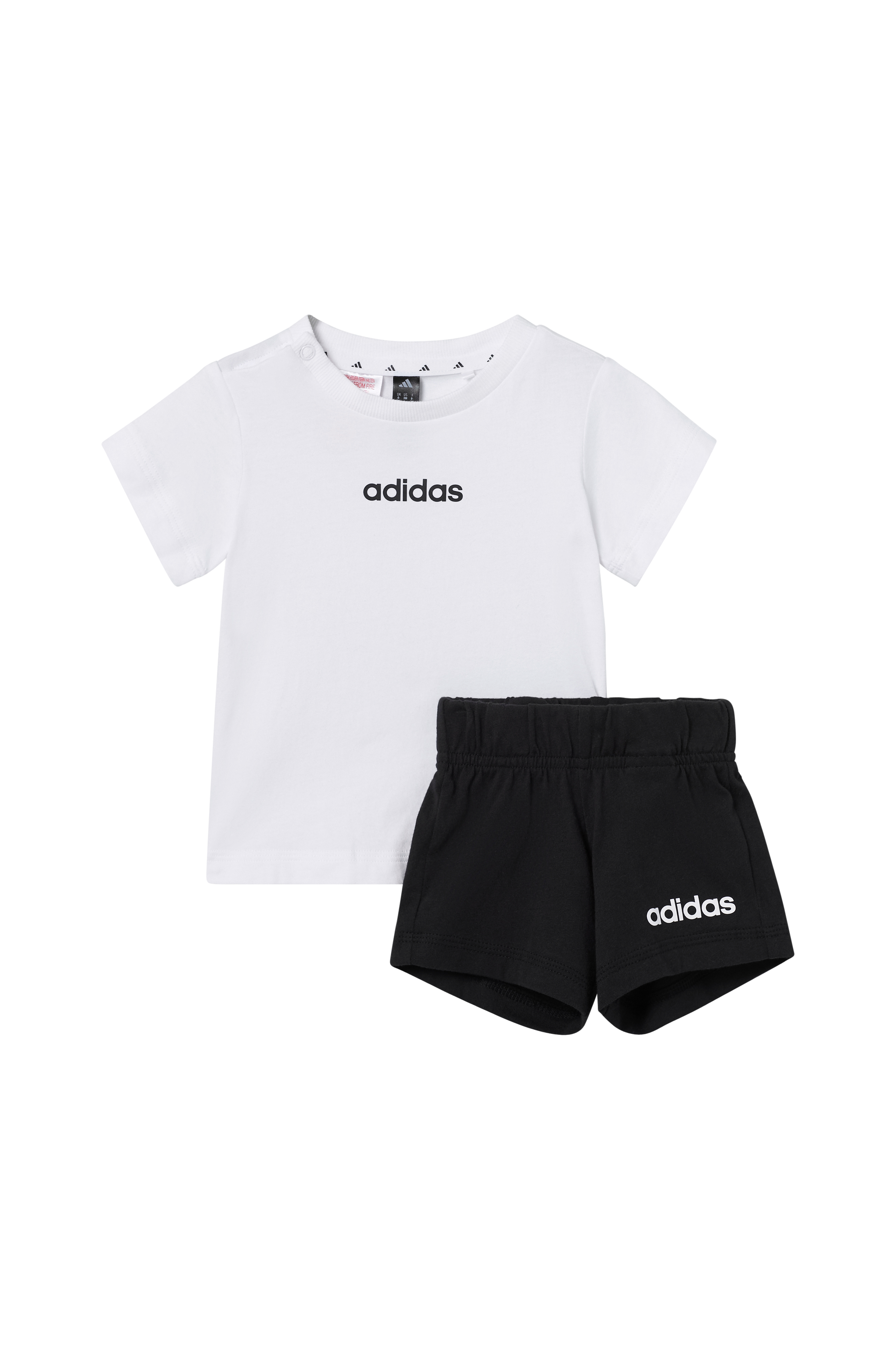 • Sæt i bomuld med t-shirt og shorts• Rund halsudskæring• Trykknapper på en skulder• Shorts med elastisk talje• Indvendig træksnørre