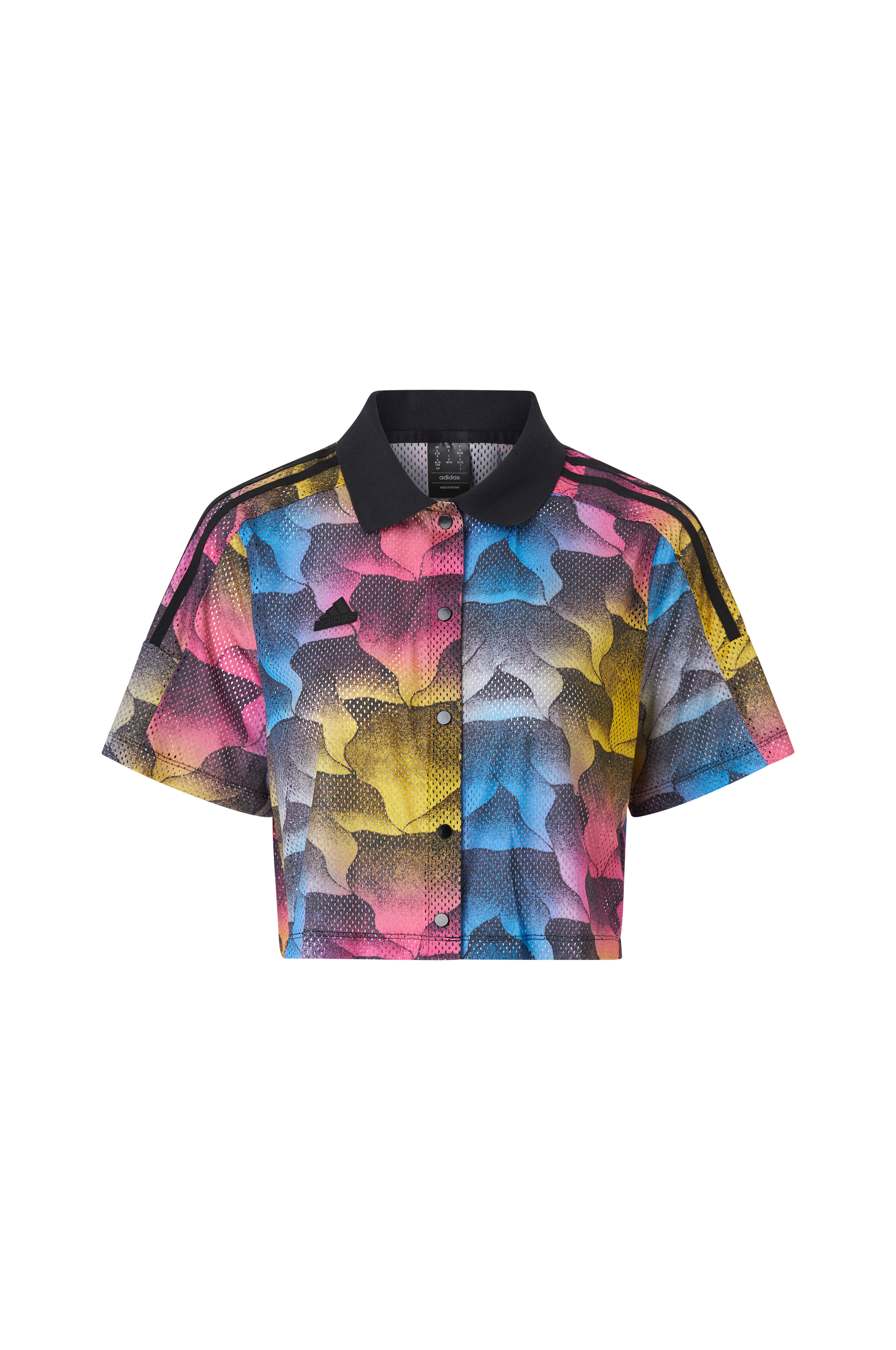 • Top i ventilerende meshtrikot• Printet mønster• Croppet længde• Løs pasform• Ribbet krave• Trykknapper