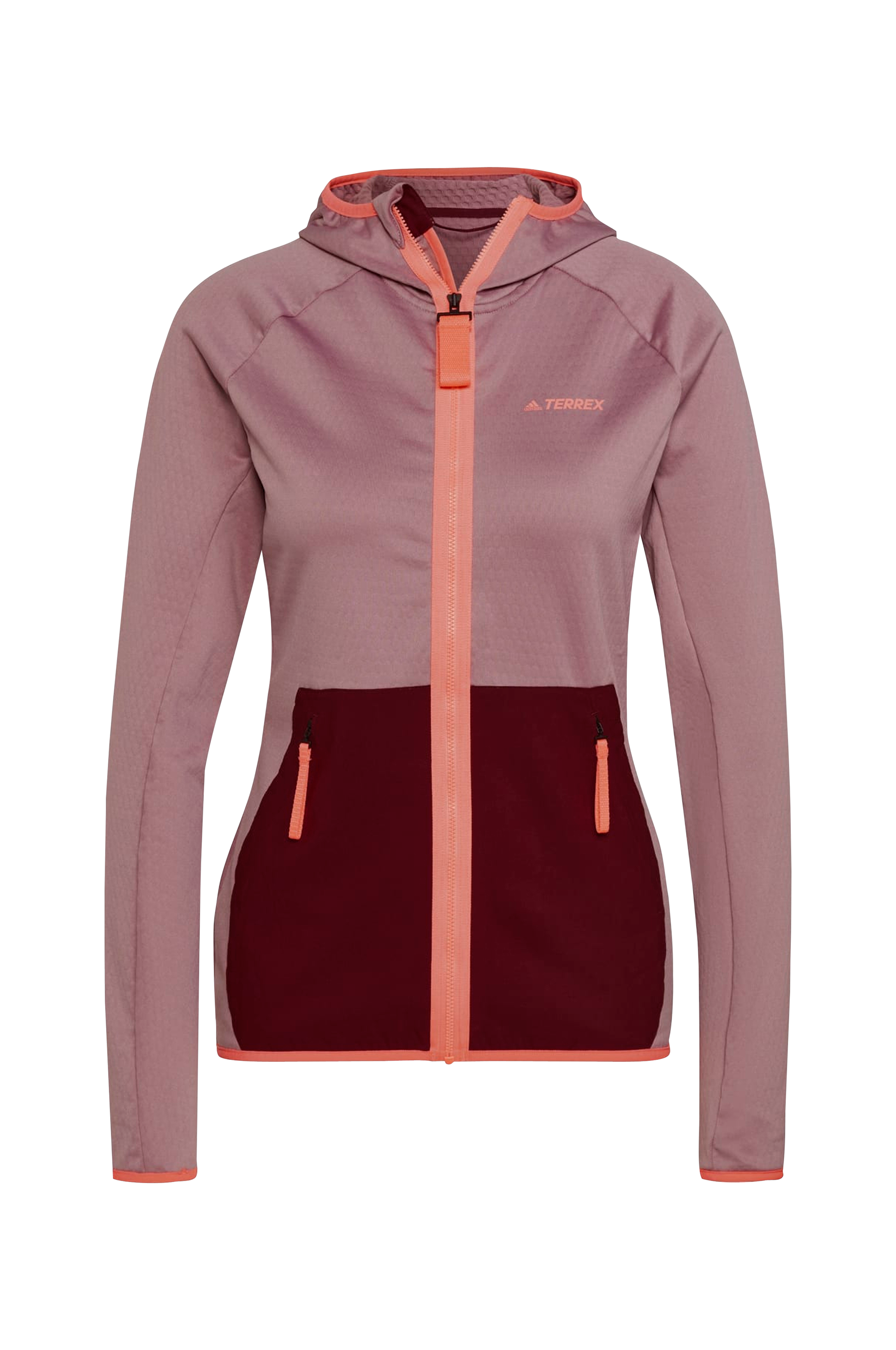 Sporty jakke i blød jersey foret med vaffelmønstret, børstet materiale som giver varme og absorberer fugt. Lynlås og to lommer med lynlås foran. Høj halsudskæring med hætte. Længde ca. 61 cm i str. S.