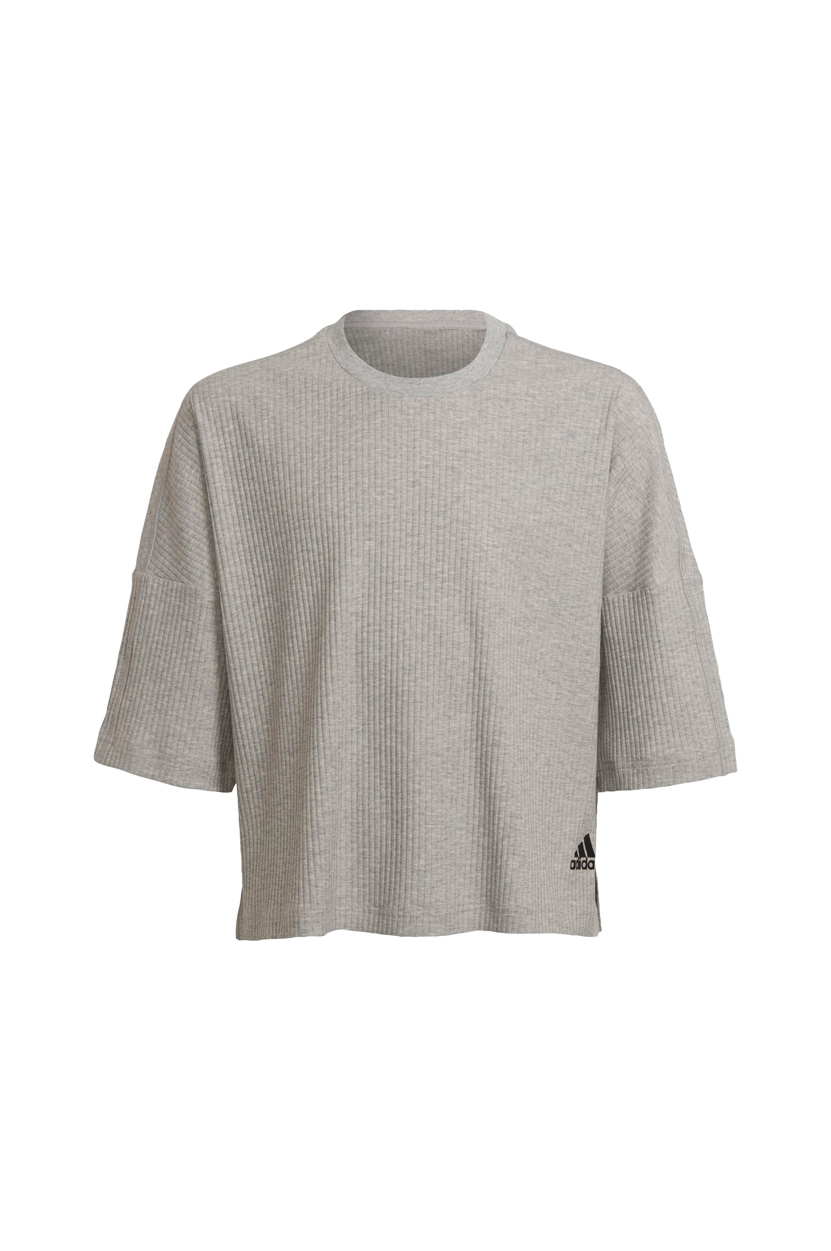 Blød træningstrøje i rib med løs pasform og stretchmateriale. Rund hals, lave skuldre og slids forneden i siderne.
