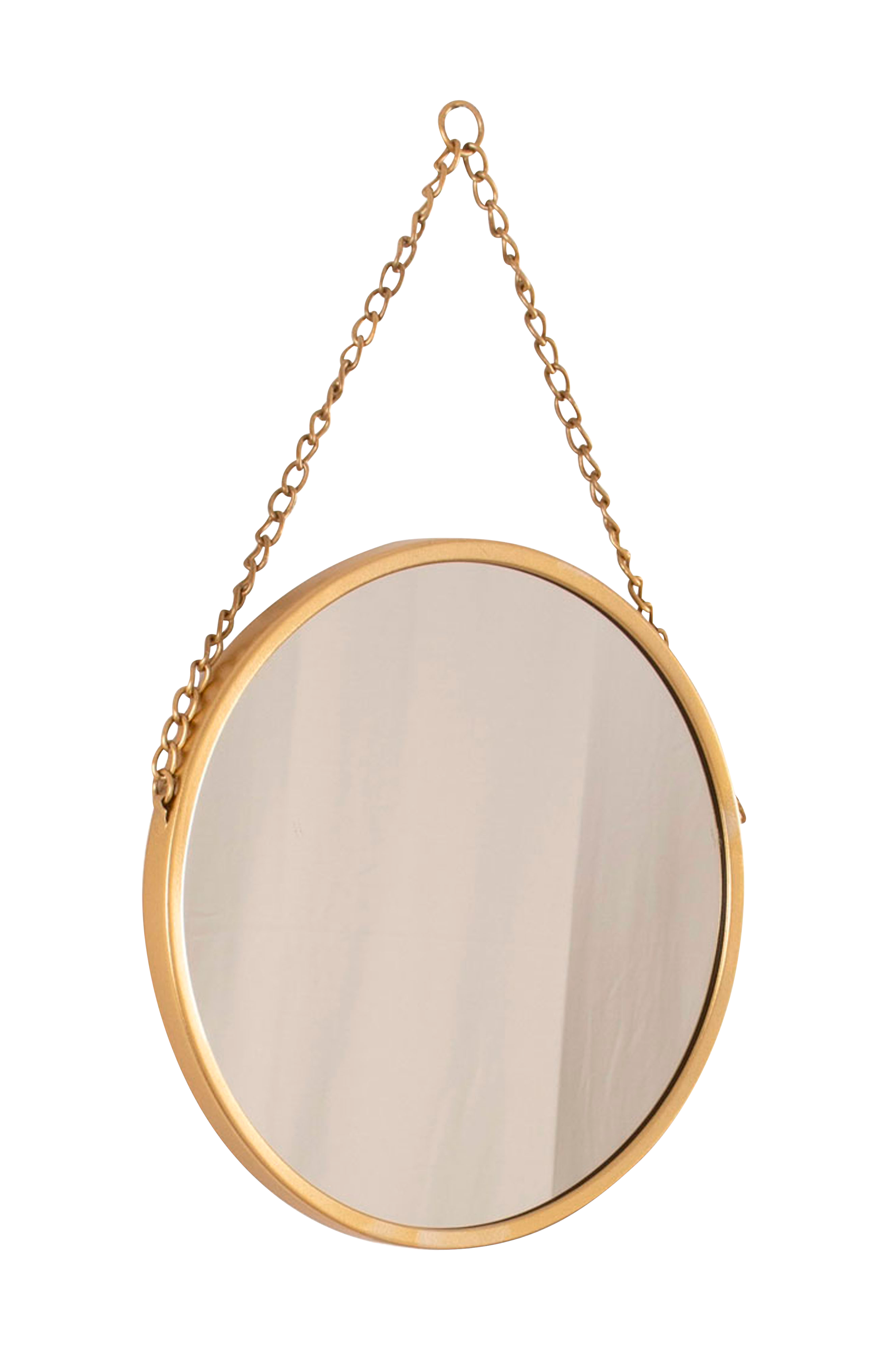Spejl med guldfarvet metalramme og guldfarvet metalkæde til ophængning. Spejlet er 30 cm i diameter og 2 cm dybt.