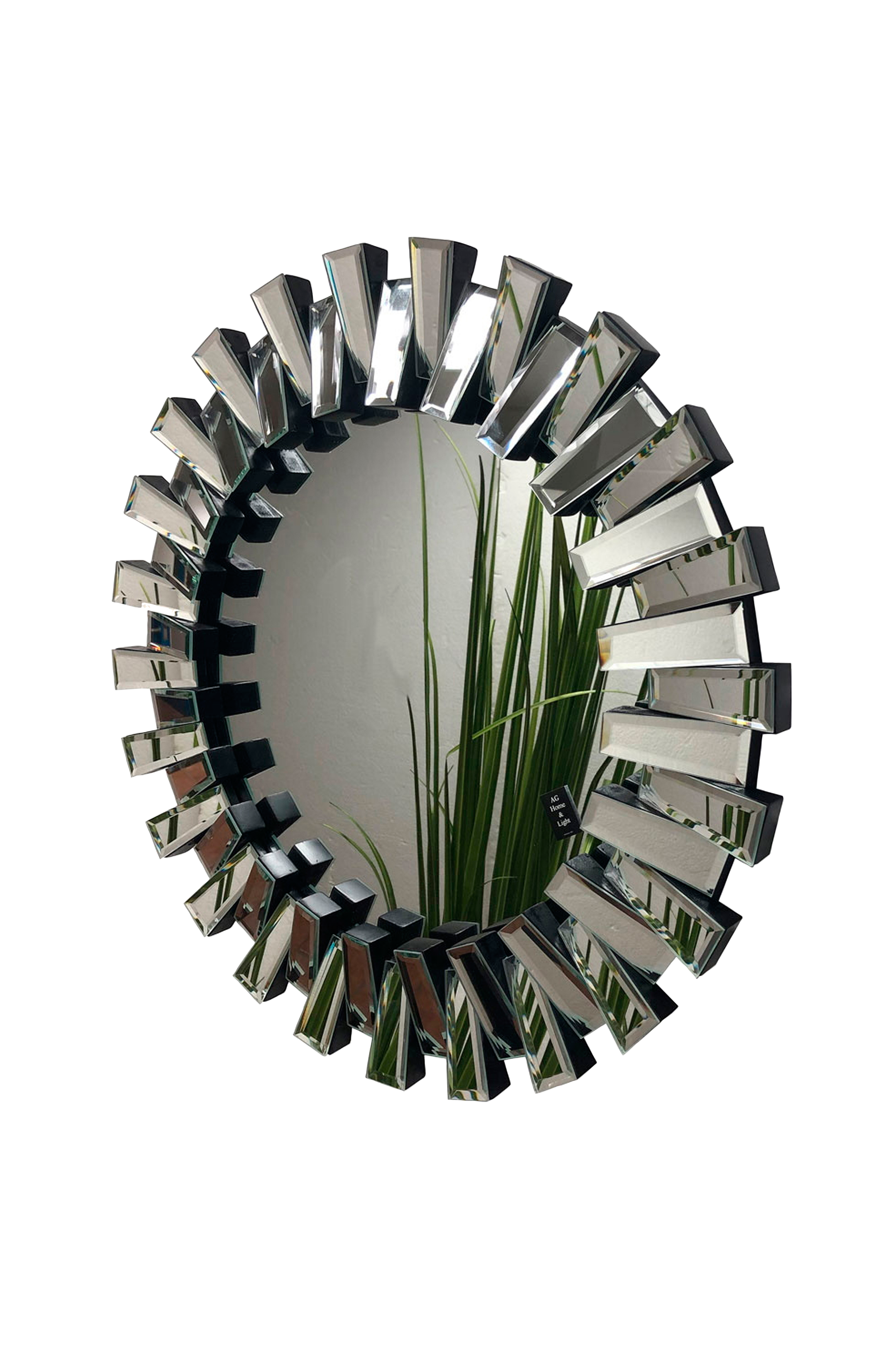 Spejl med MDF/spejlglasramme, 56 cm i diameter og 4 cm dybt. Vægbeslag medfølger.