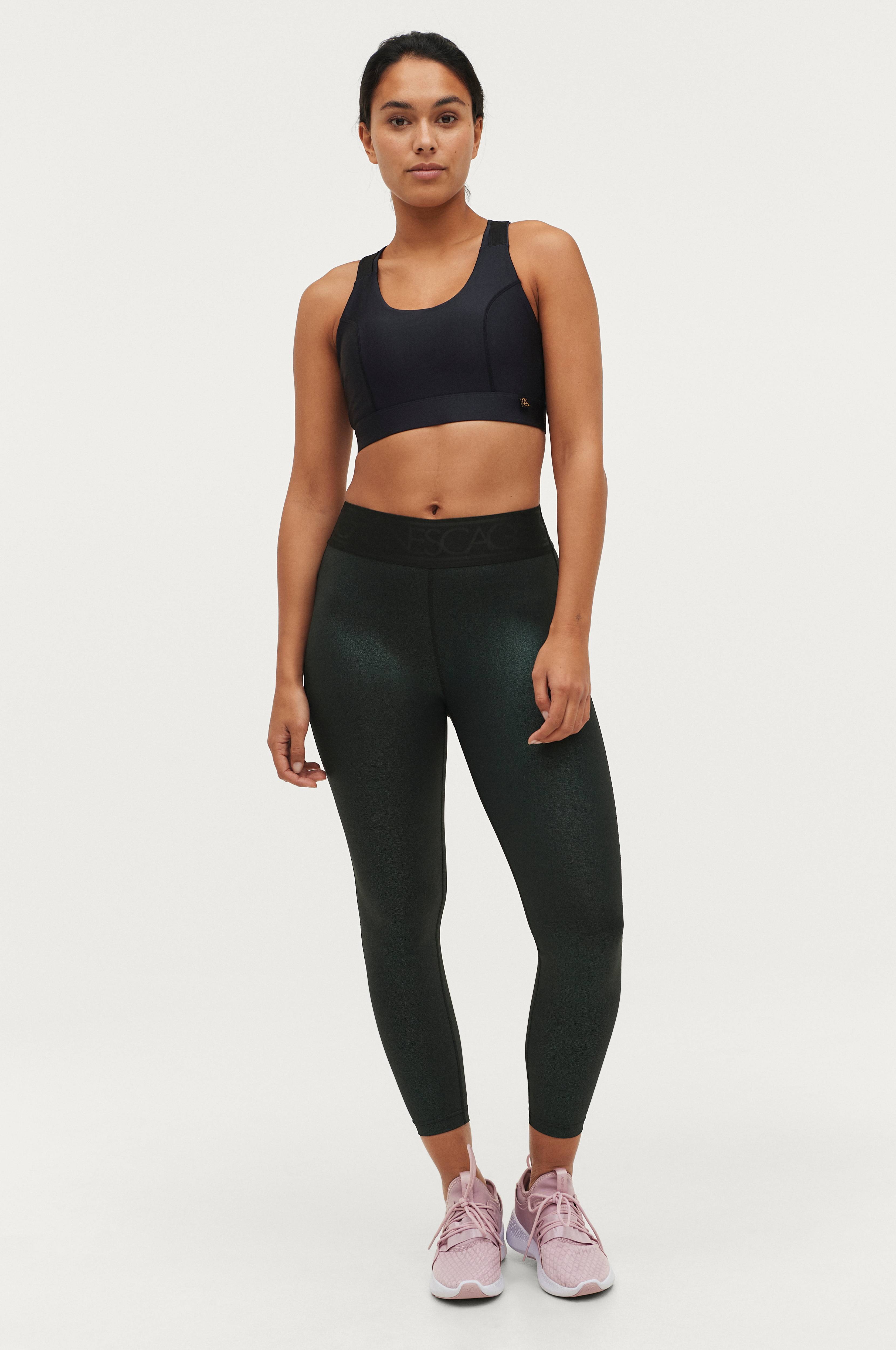 Ankellange træningstights i metallicfarvet funktionsmateriale som transporterer fugt væk fra kroppen. Bred elastik med logo i taljen. Benlængde ca. 61 cm i str. 36/38.