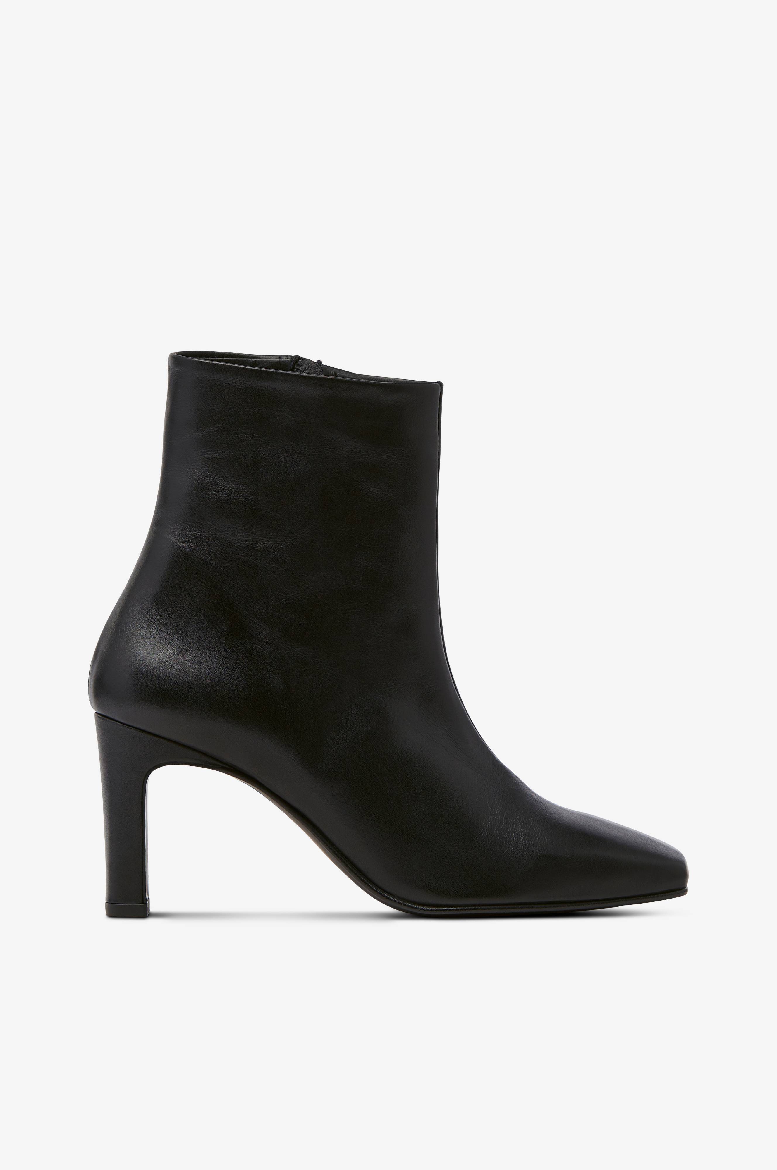 Boots i skind med lige skåret tå og beklædt hæl. Lynlås på indersiden af skaftet. Tekstilfor og indersål i skind.