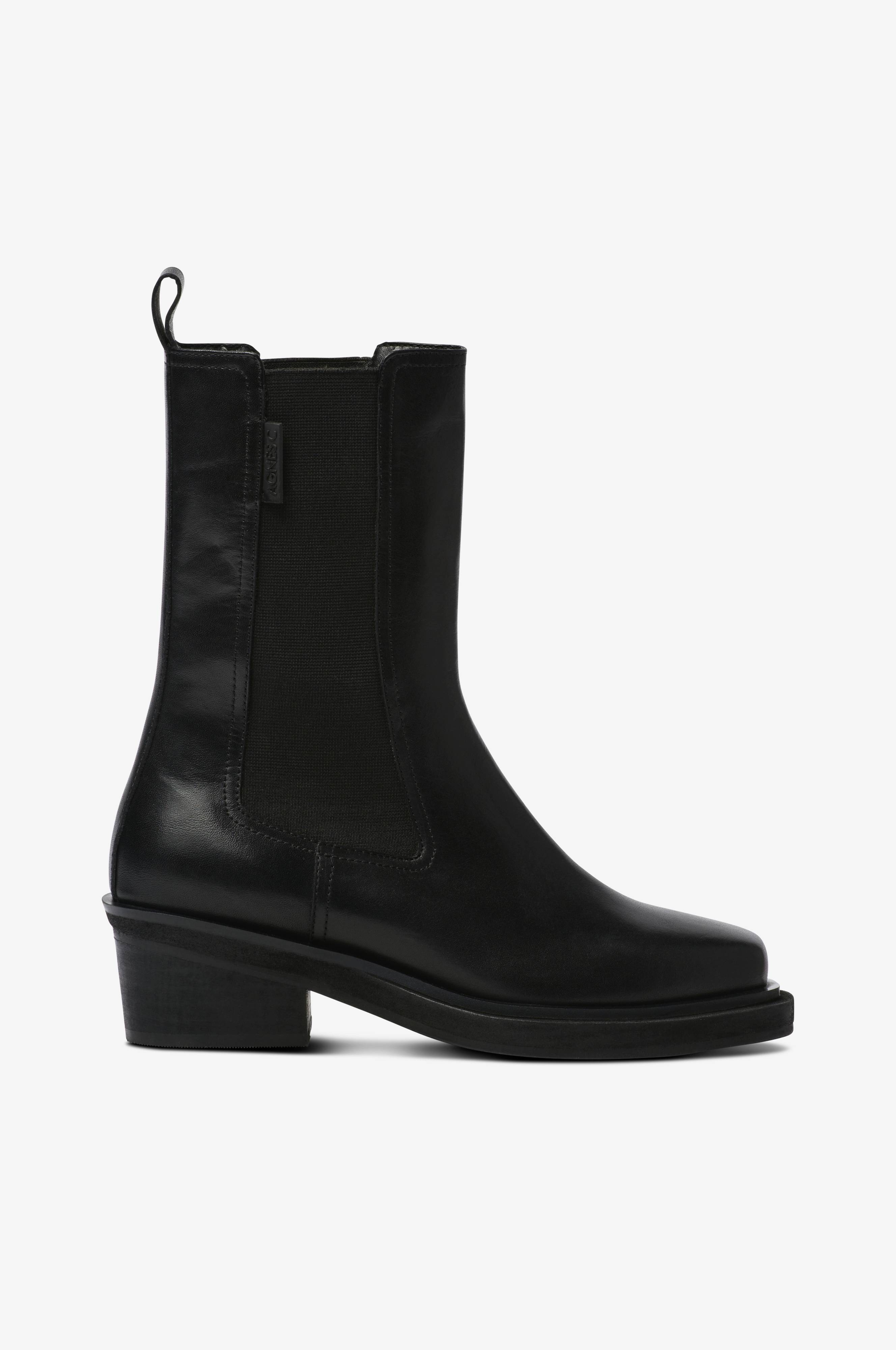 • Chelseaboot i læder • Lige snude • Elastiske paneler på siderne • Trækstrop oppe bagved • Tekstilforing • Skafthøjde: 20 cm i str. 37 • Hælhøjde: 5 cm
