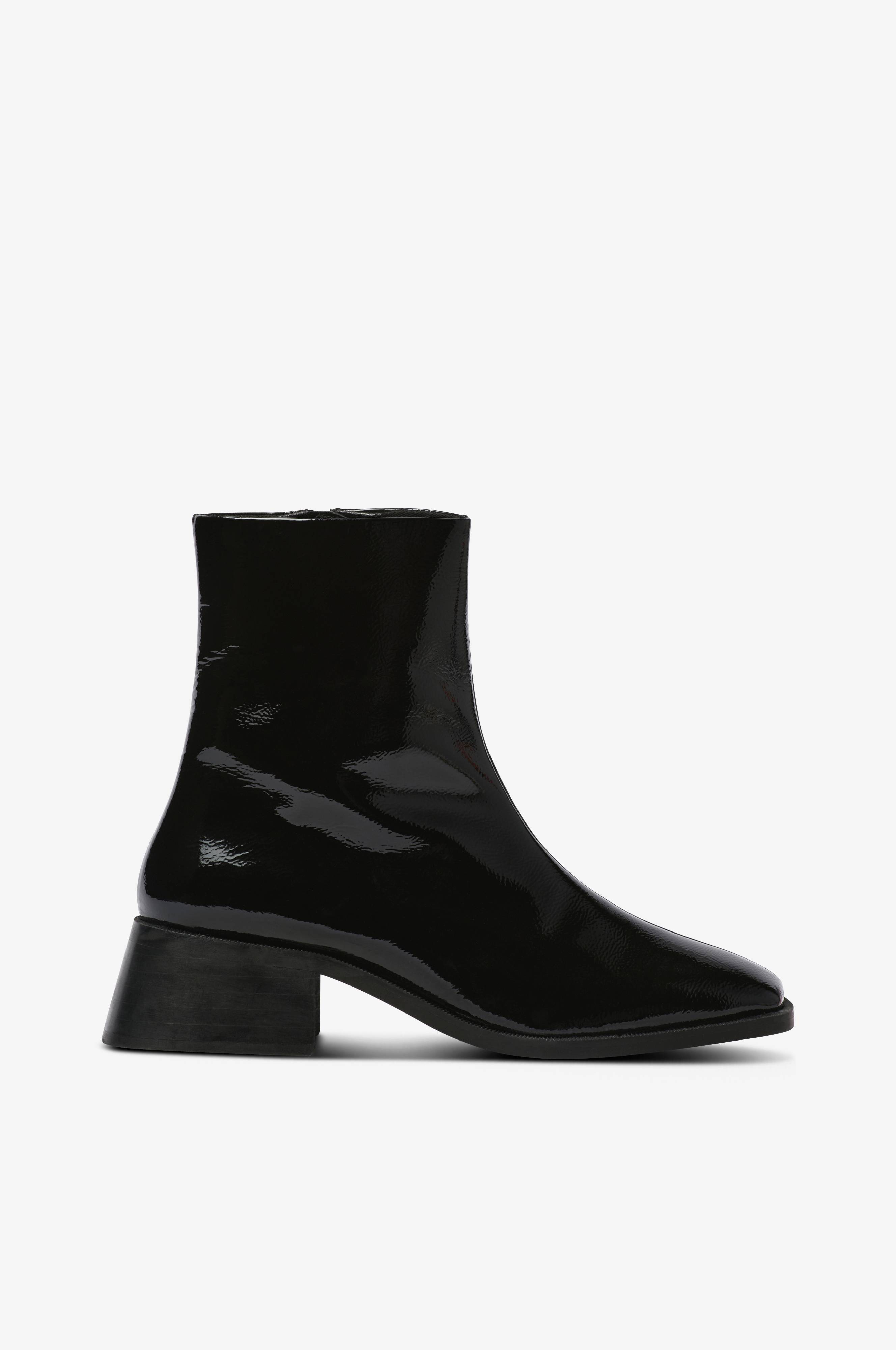 Model i blankt skind med lige skåret tå. Delesøm på langs midt foran og lynlås på indersiden af skaftet. For af tekstil.